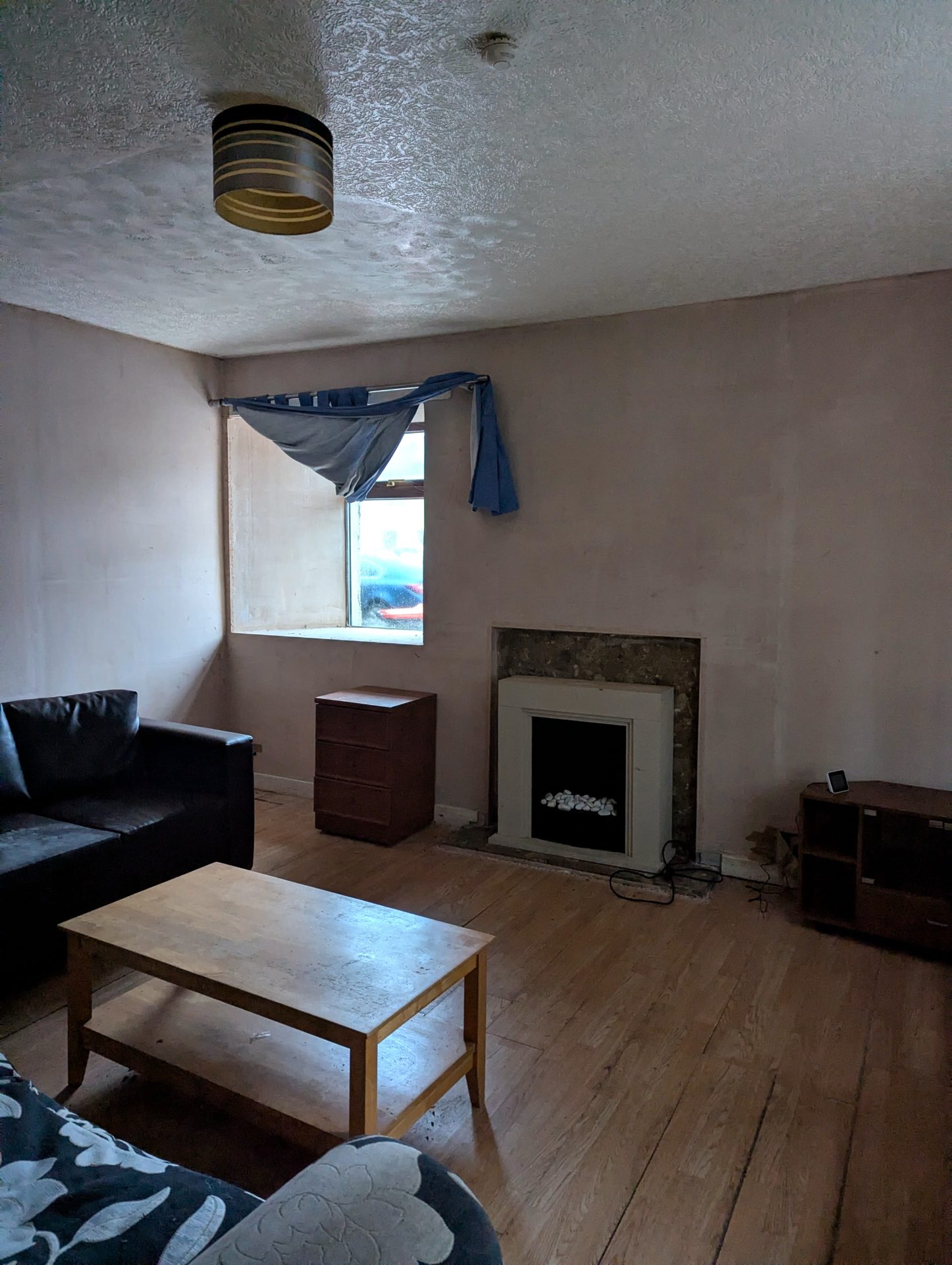 Wooden laminate flooring, double glazed window to front and side of the property, radiator, fireplace. Stairs to upper accommodation.