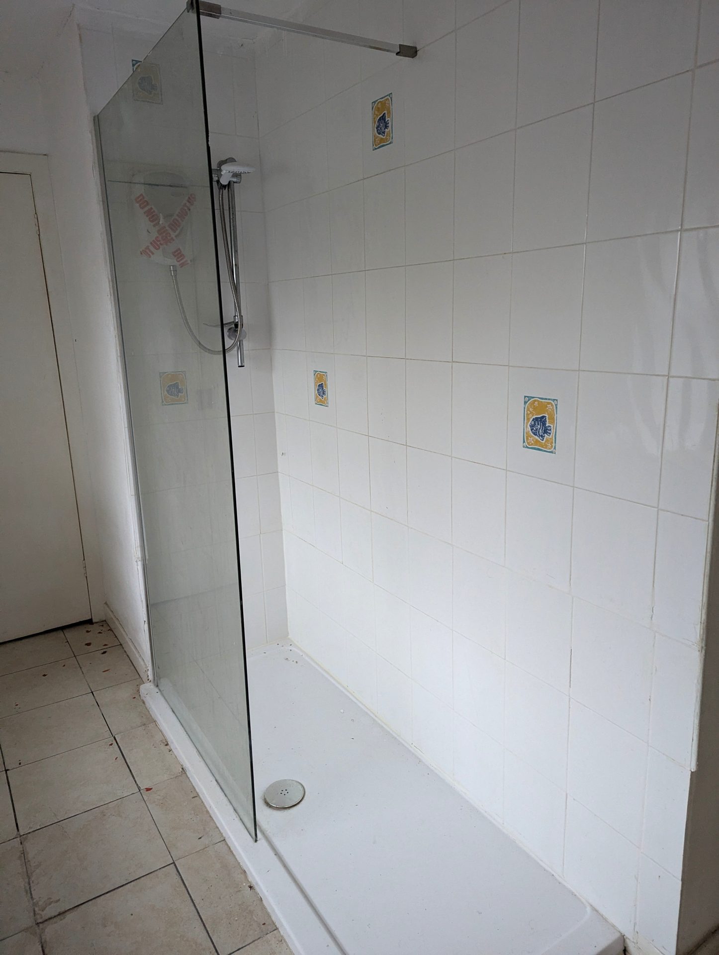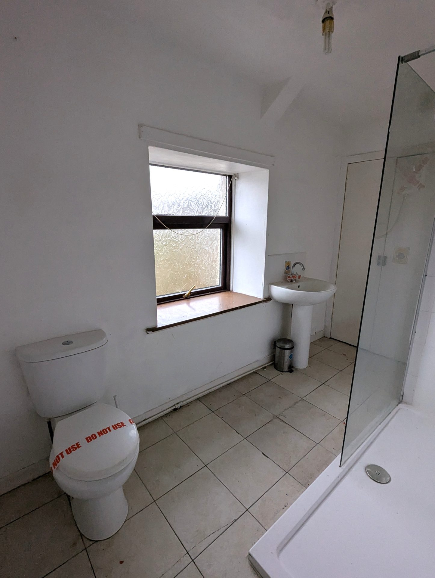 Tiled flooring, walk in shower, Triton shower, built in storage cupboard, wash hand basin, WC, frosted window to rear.