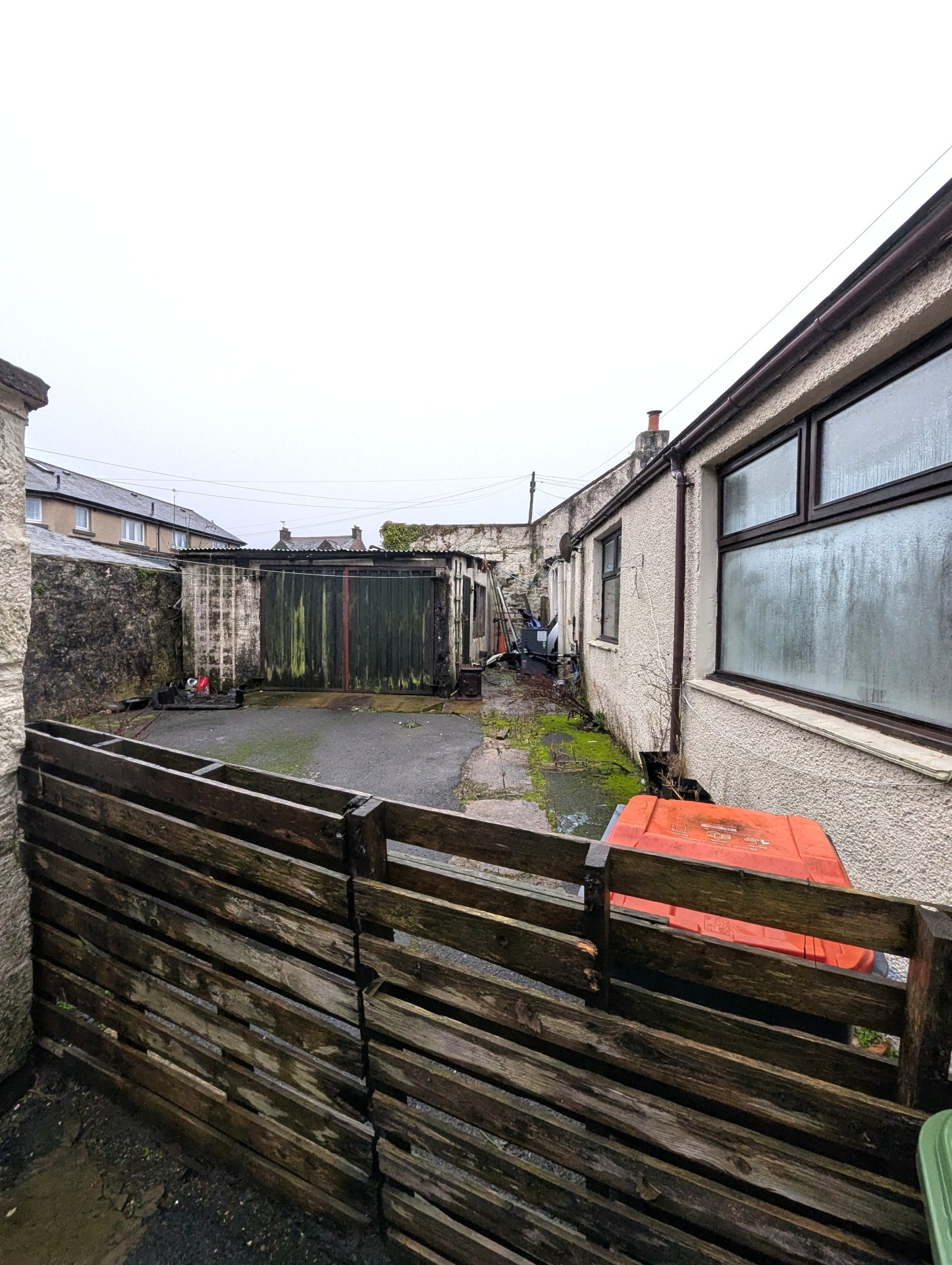 There is a garden enclosed by stone walls, a detached workshop with a shallow pitched roof of metal sheeting.