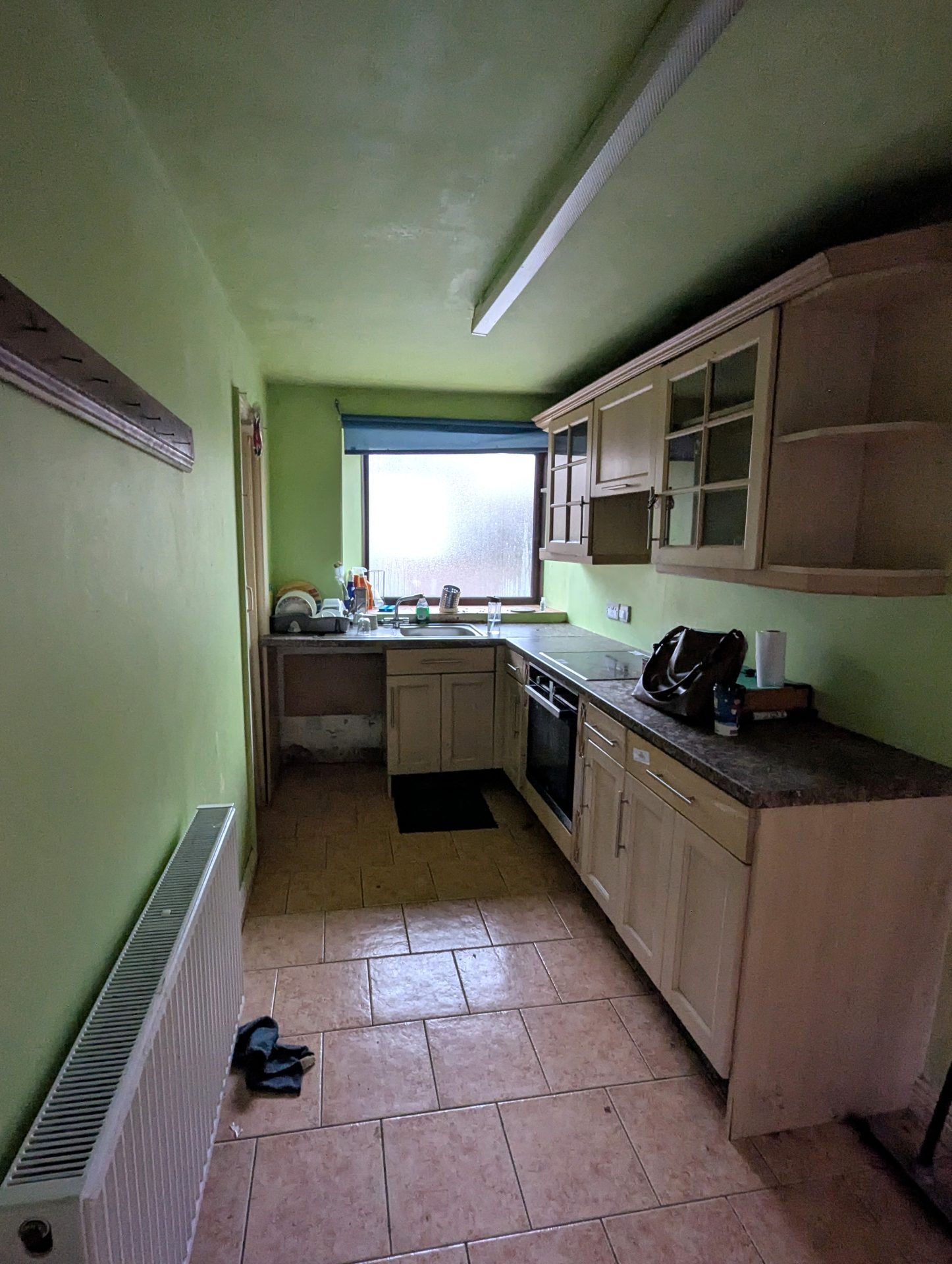 Tiles, radiator, double glazed window to front and back, fitted base and wall units, integrated oven and hob top, stainless steel sink & drainer. Door into pantry cupboard.