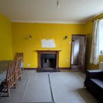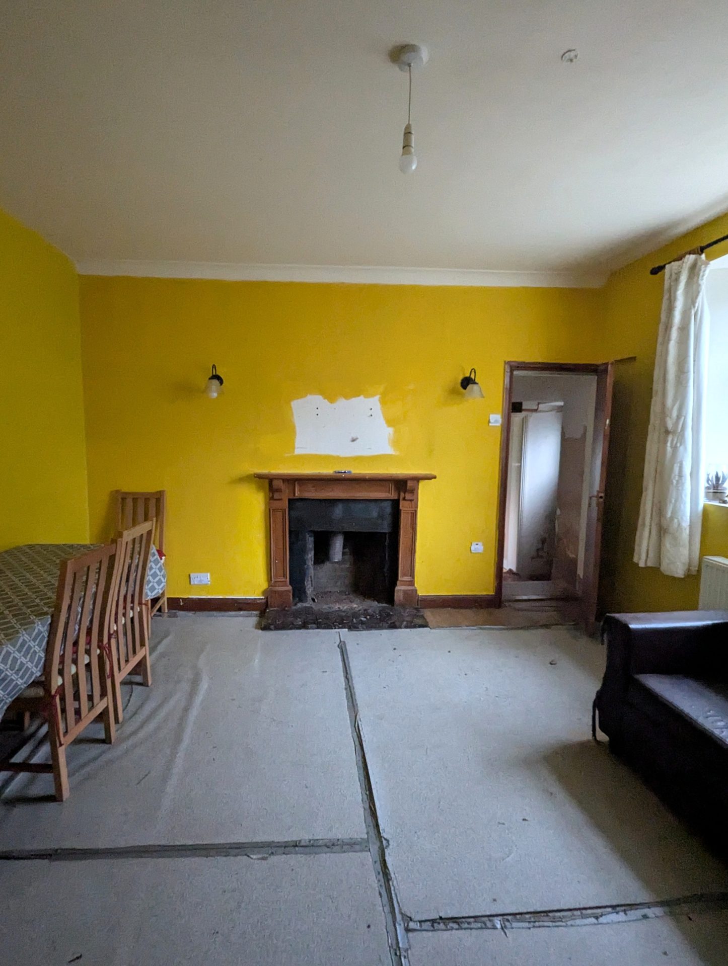 Living room / dining room, double glazed window to front, wooden fireplace, radiator, door with steps up to rear hallway.