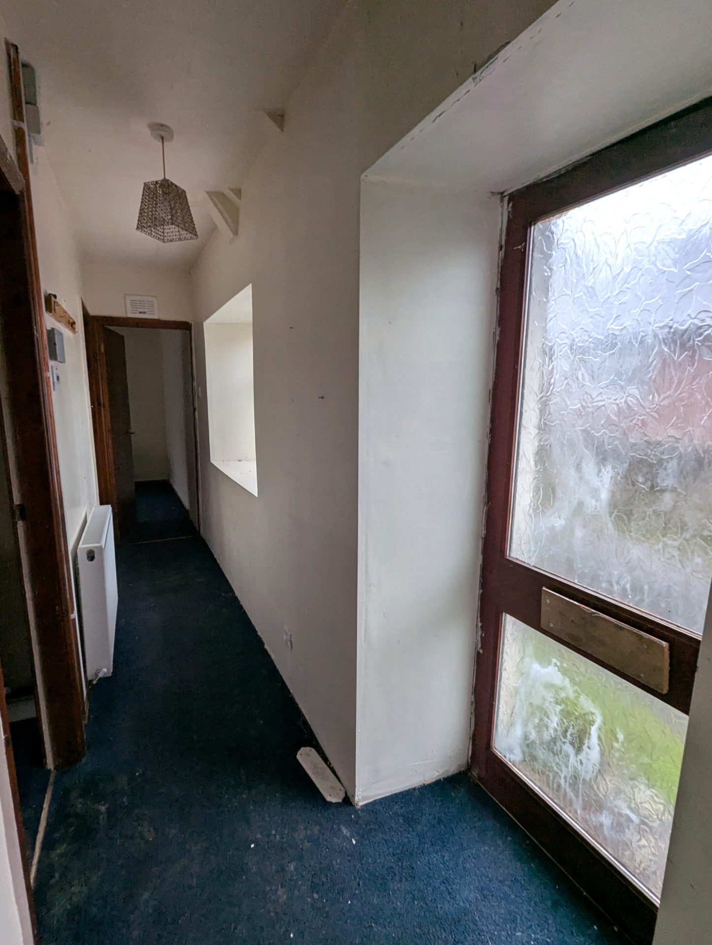 Steps up to rear hallway from living room, door out to rear, door to two bedrooms and the shower room.