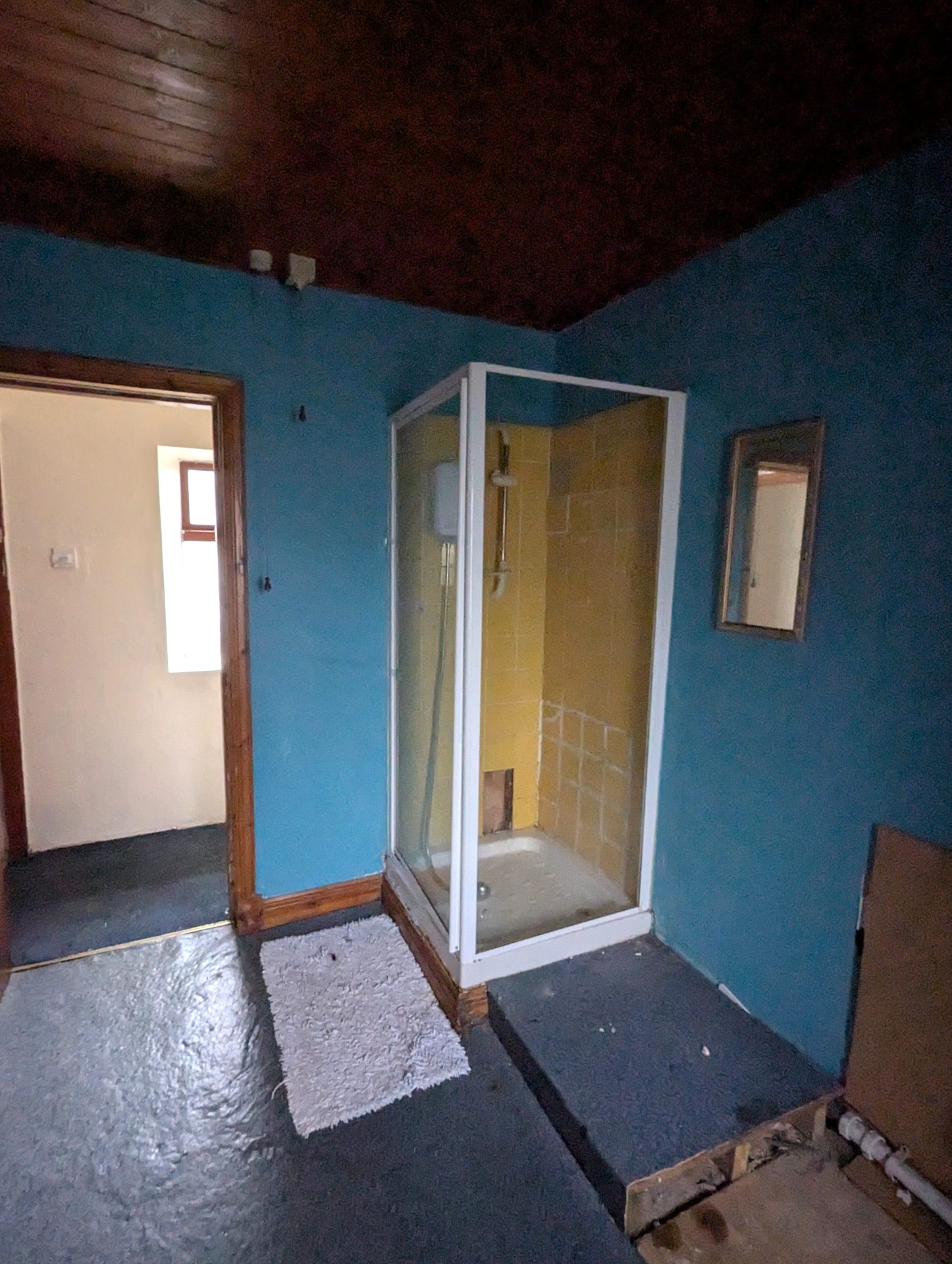 Tiled shower cubicle with triton shower, linoleum flooring, rabiator, WC, frosted double glazed window to front, wash hand basin, water tank.