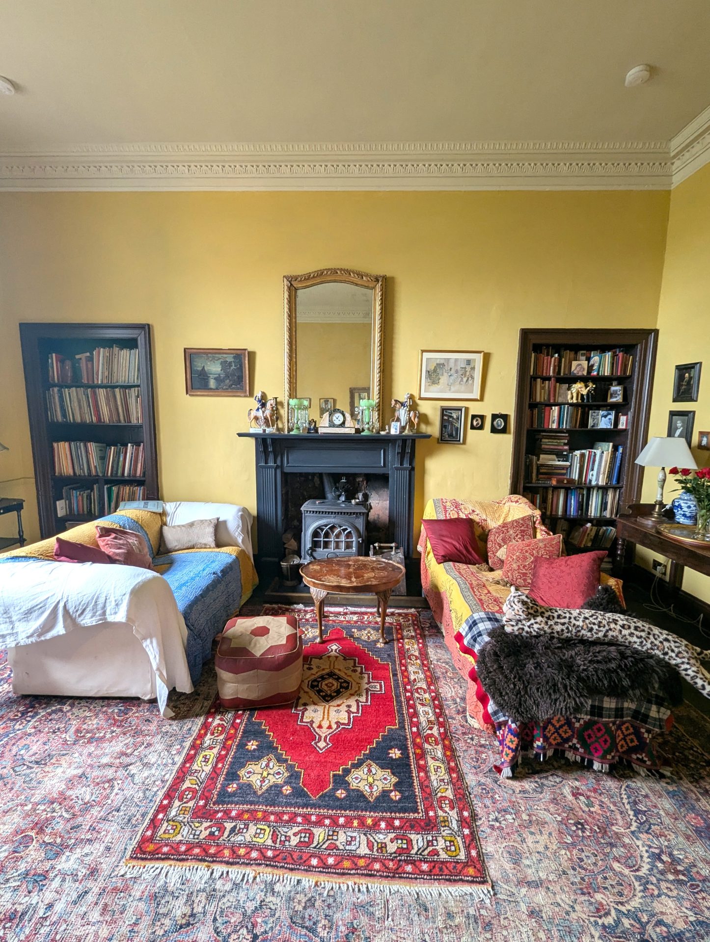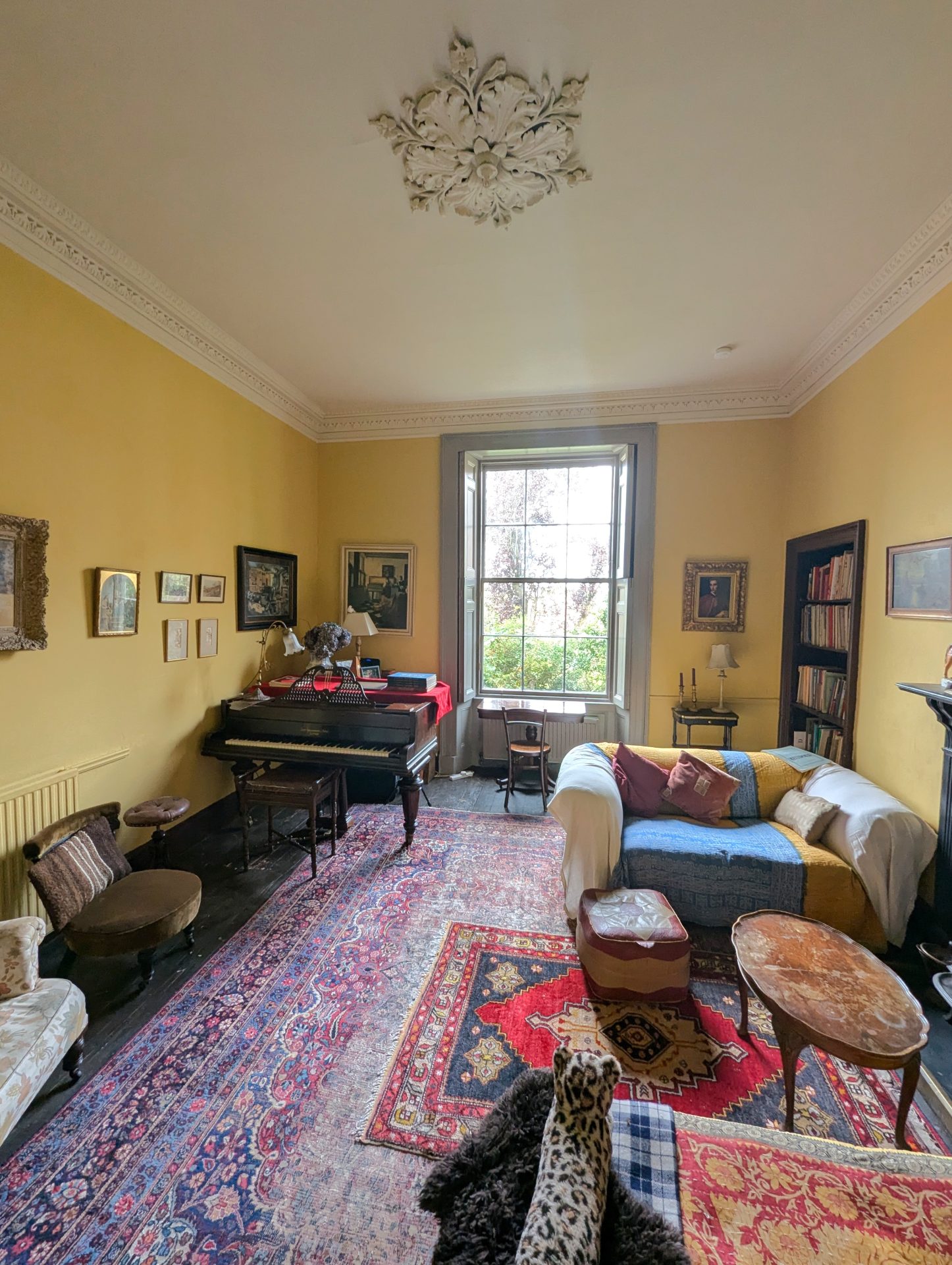 Door into the living room from the ground floor hallway, fireplace with multifuel fire, two radiators, window to the rear overlooking the garden.