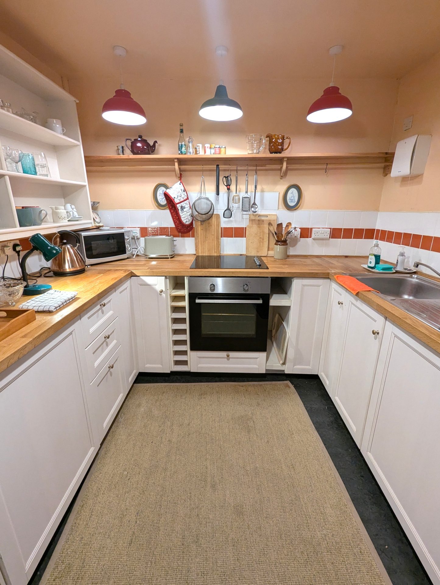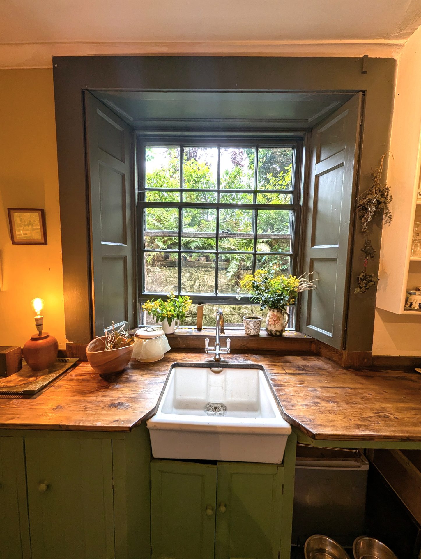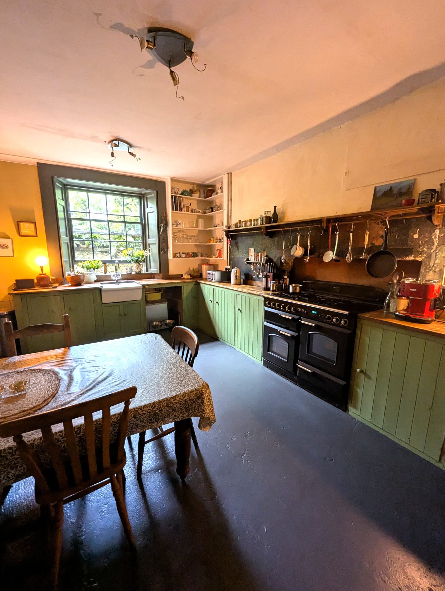 Kitchen in the basement level with window looking out to the rear of the property, door into the basement hallway. Fitted base units and open shelving, Belfast sink, radiator.