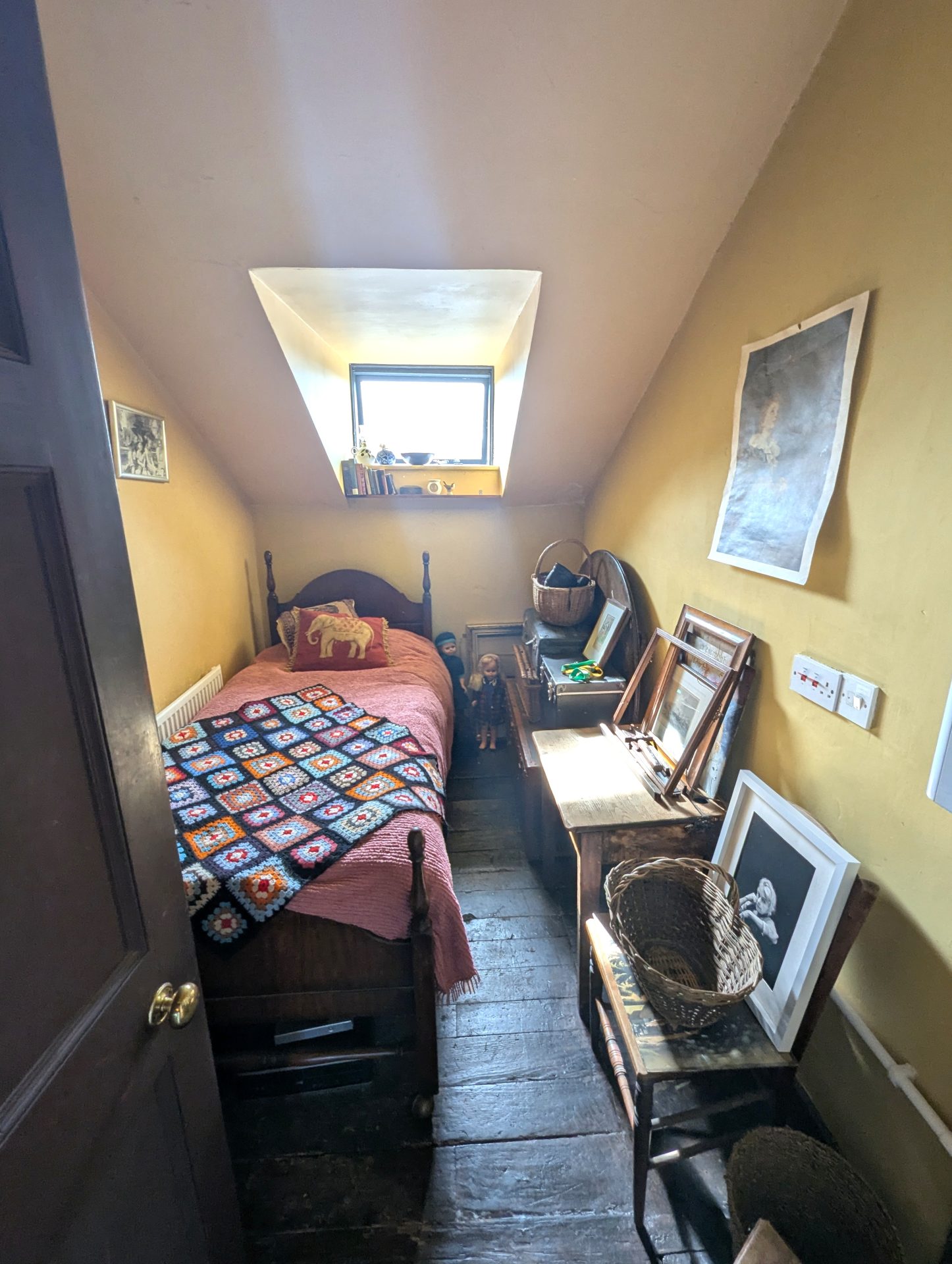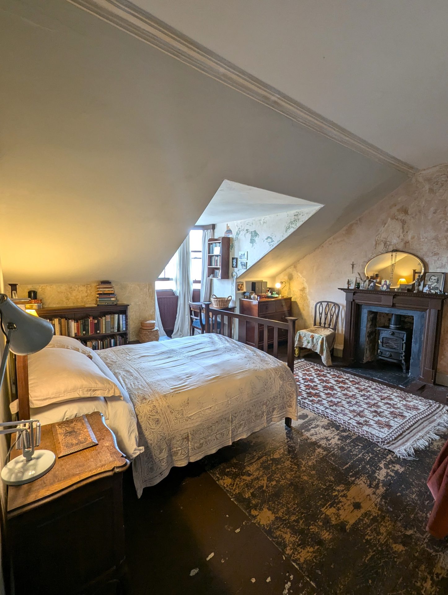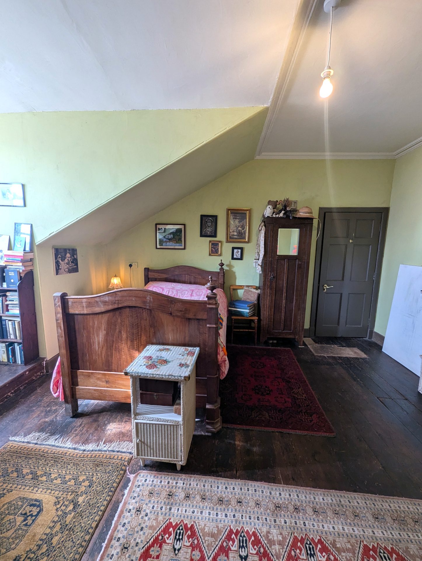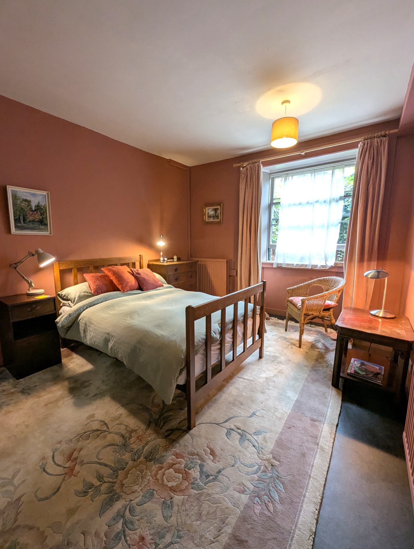 Door into bedroom four from the second floor hallway, bay window looking out to the rear, radiator, fireplace with multifuel fire, storage cupboard.