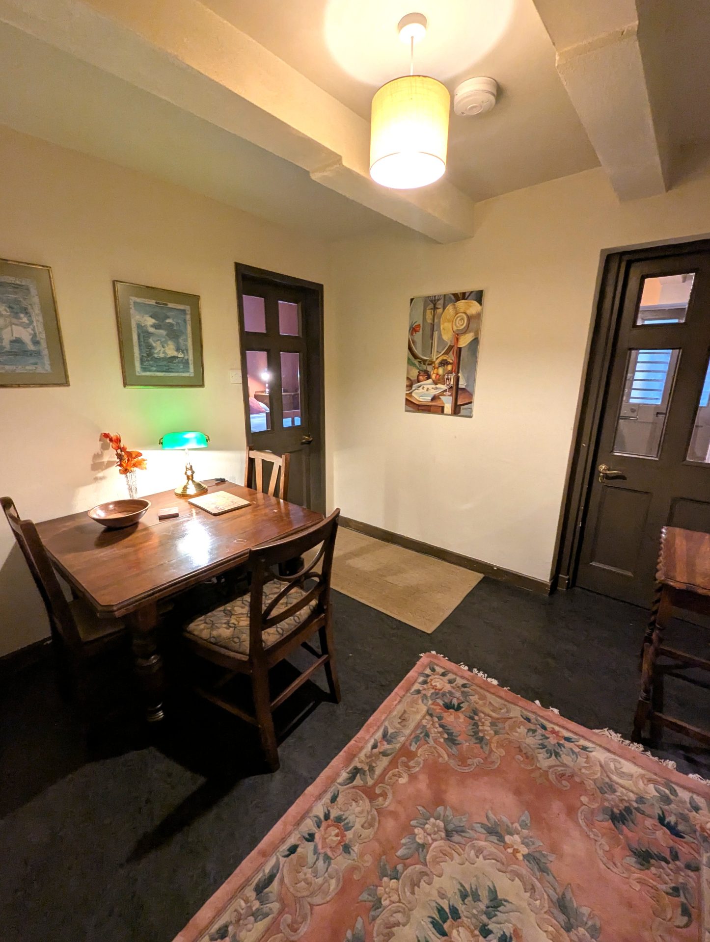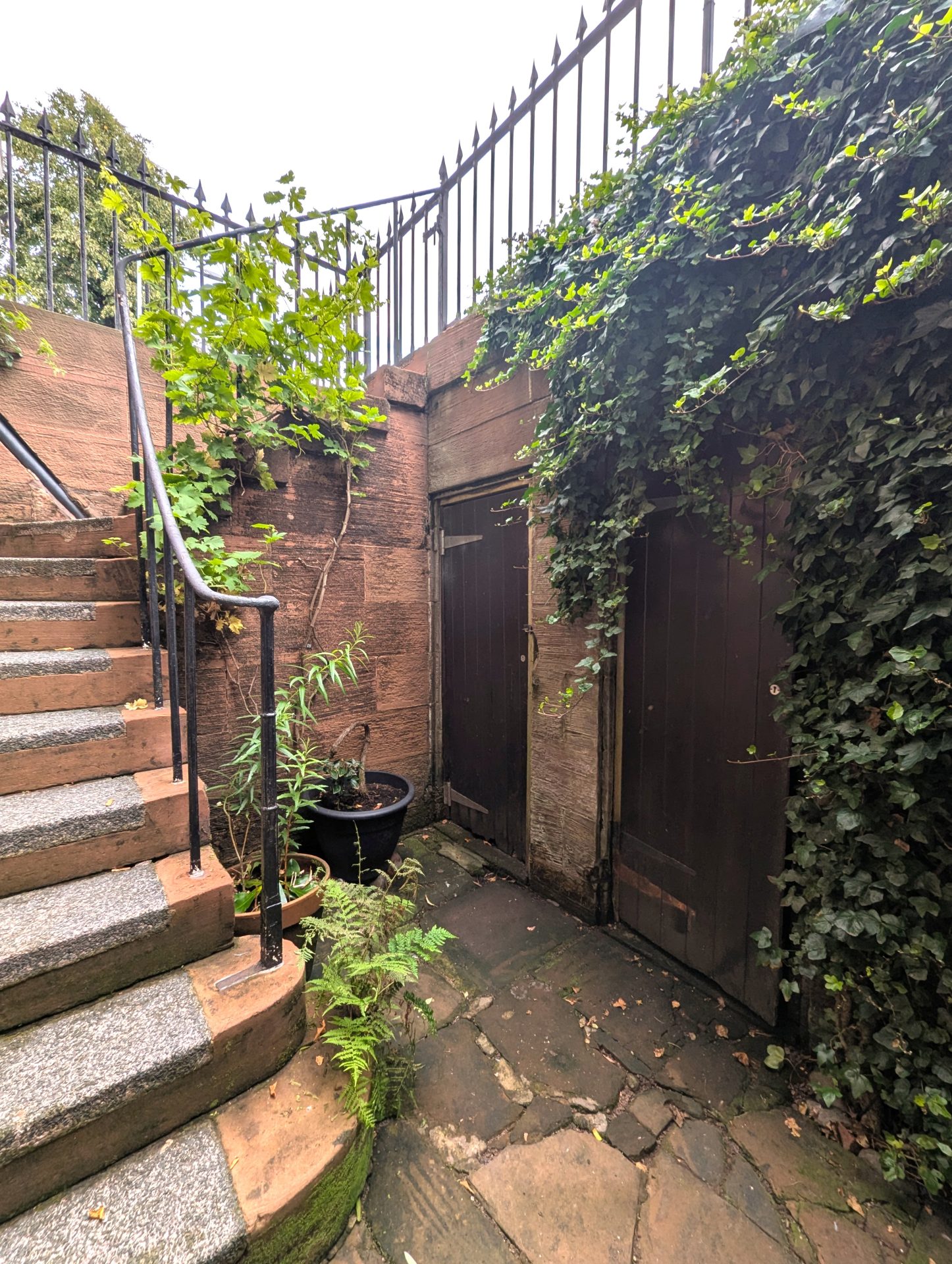 Steps down to the basement from pavement level, doors to three store cupboards and entry door leading into the kitchenette.