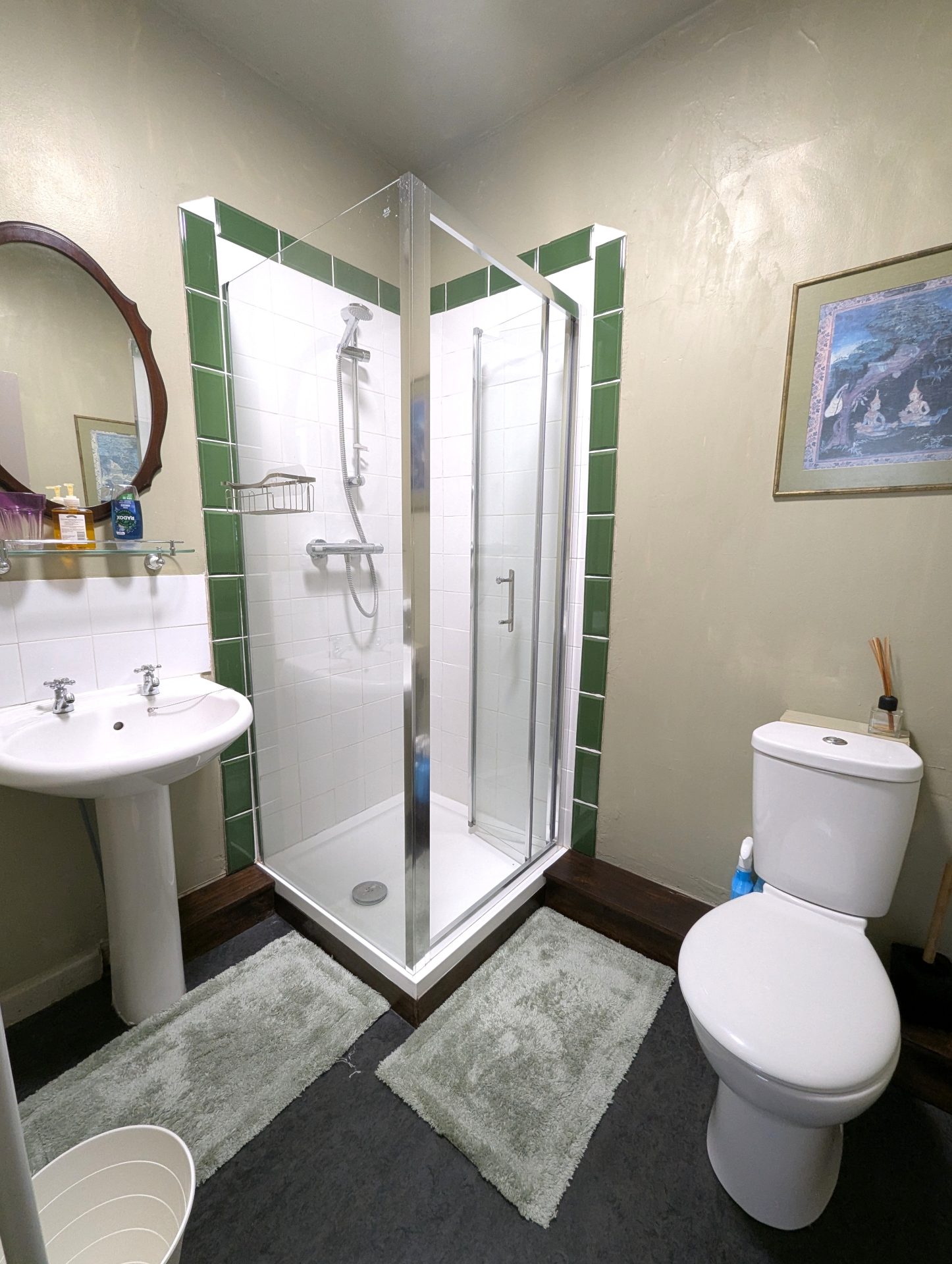 Door from bedroom into the en-suite shower room, shower, WC, wash hand basin.