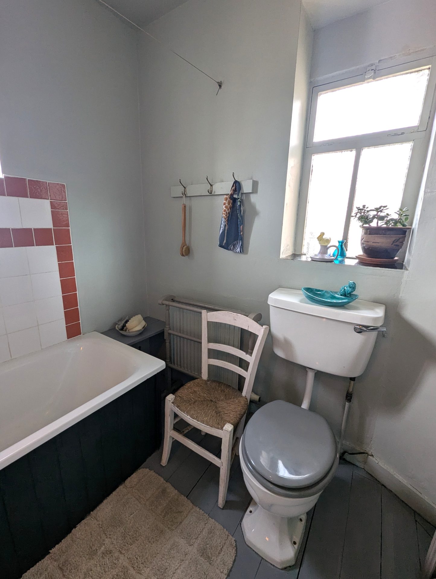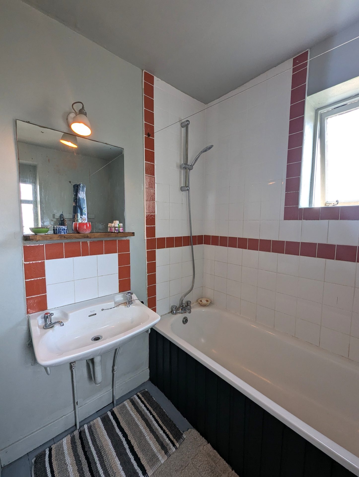 Door into the bathroom from the landing leading up to floor two, bath with overhead shower, WC, wash hand basin, window to side and rear.