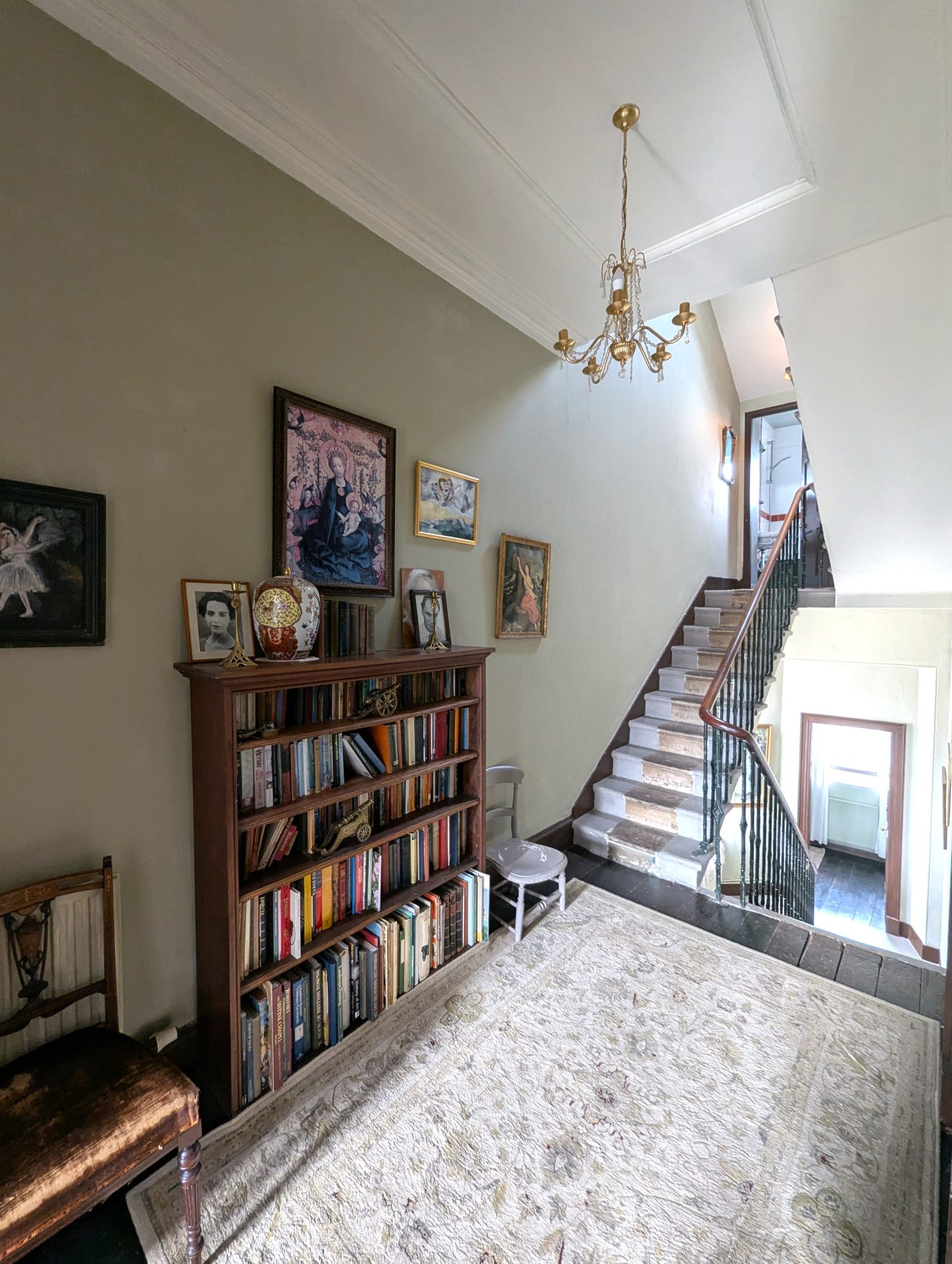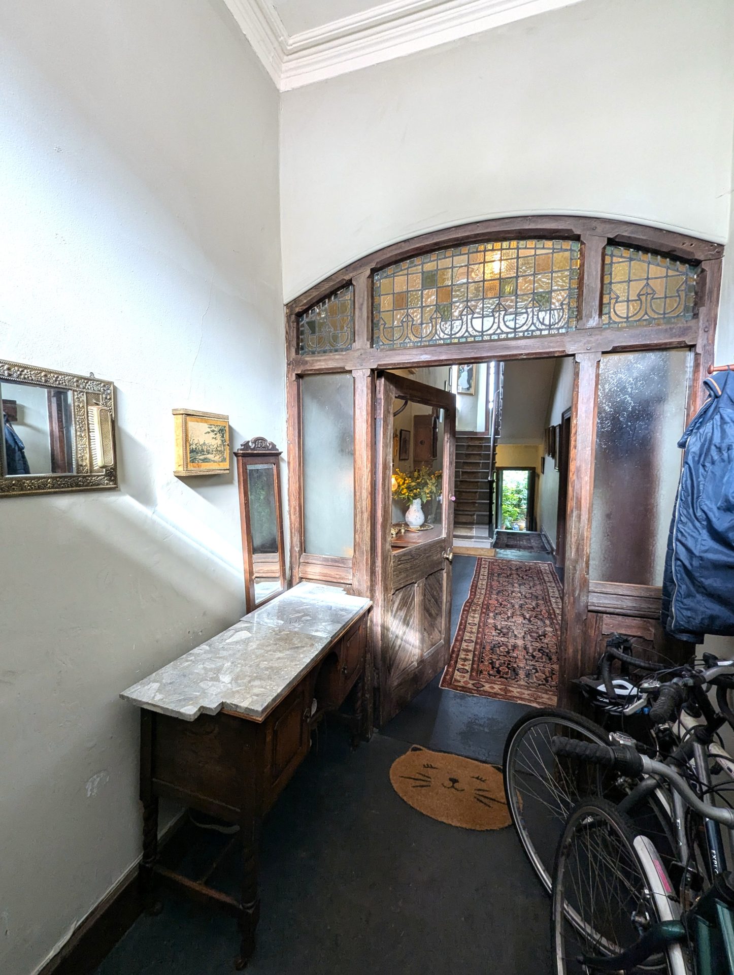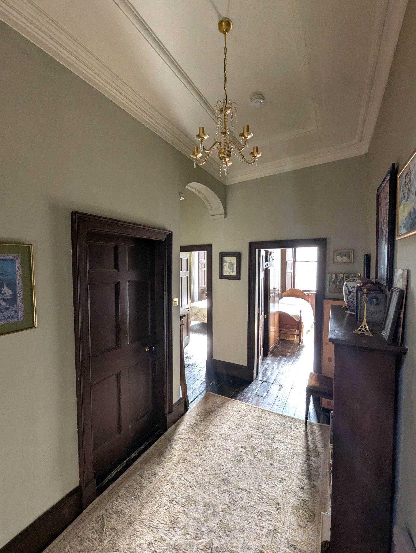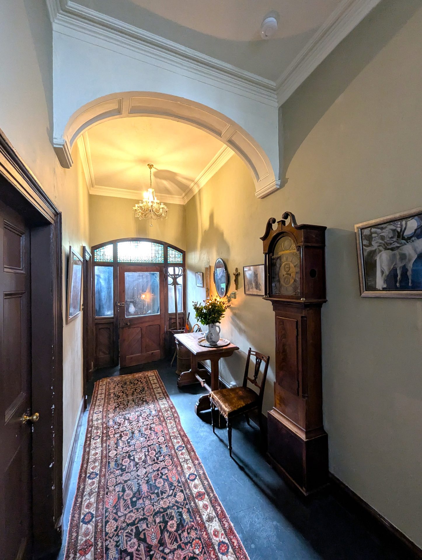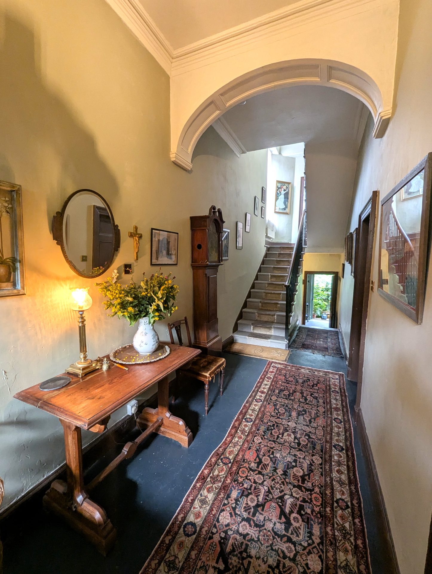 Ground floor hallway, doors to the living room, dining room and entrance vestibule. Stairs to upper accommodation, steps down to rear porch.