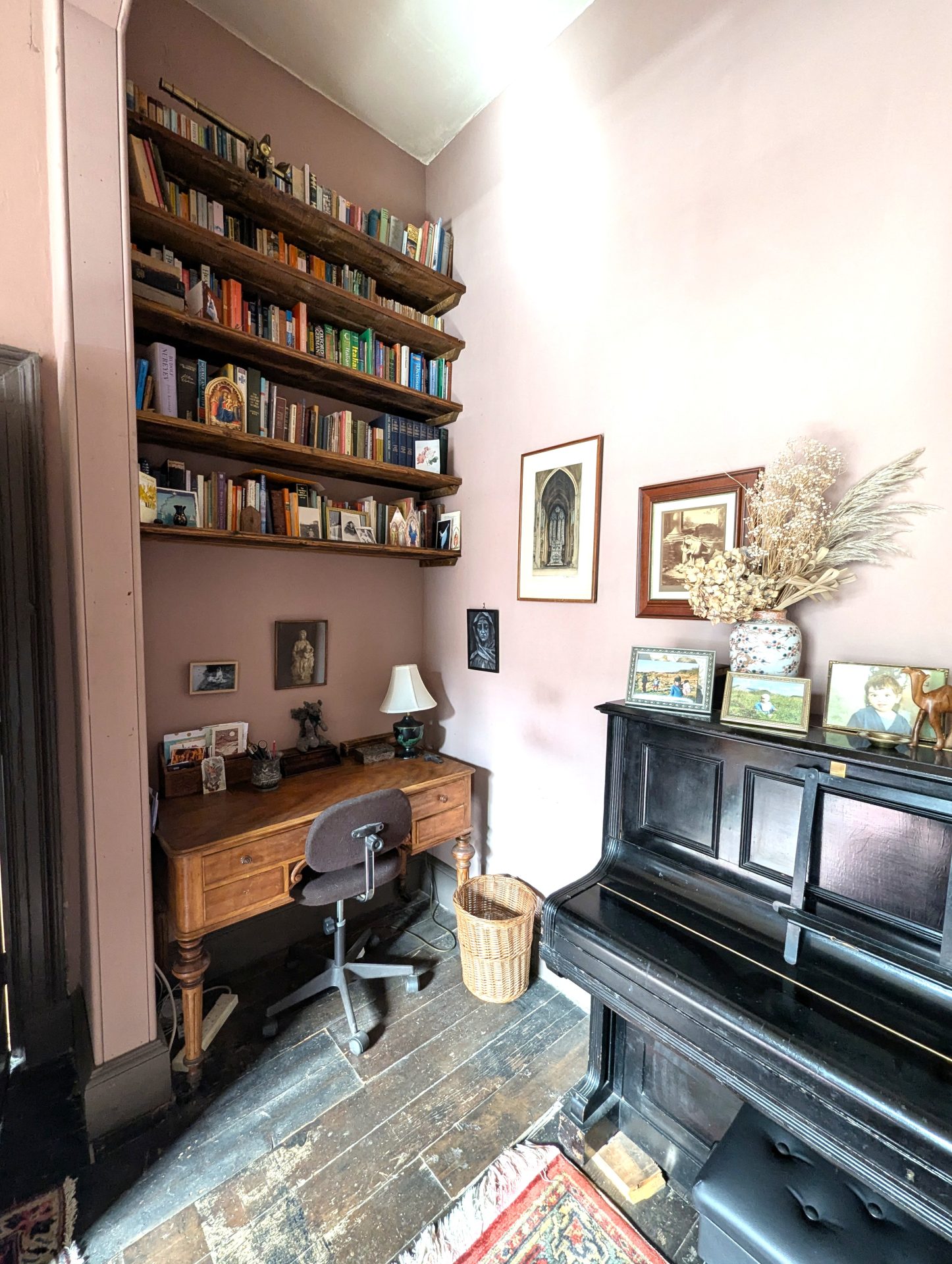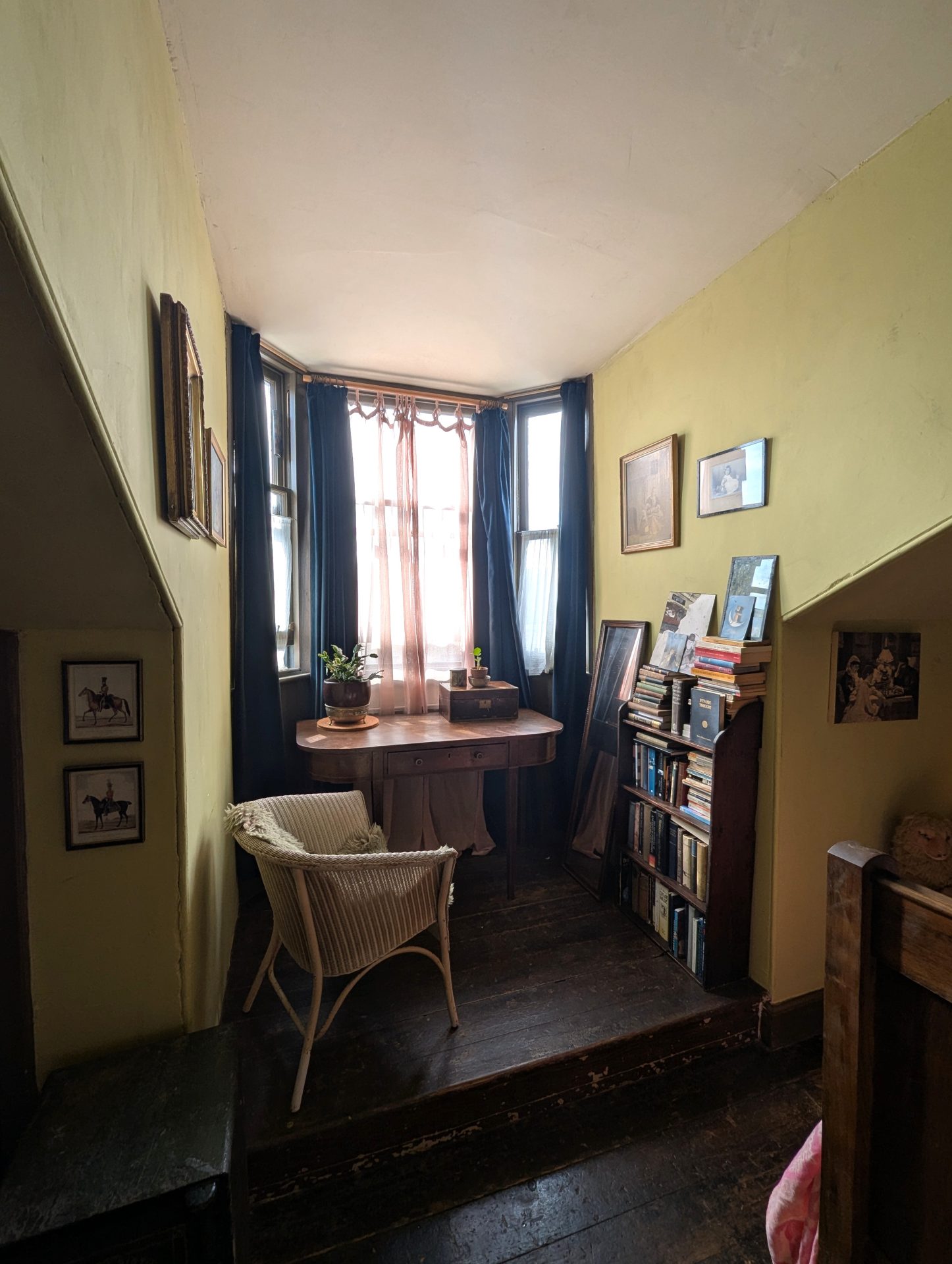 Door into bedroom study from the second floor hallway, boiler, radiator, window to the front.