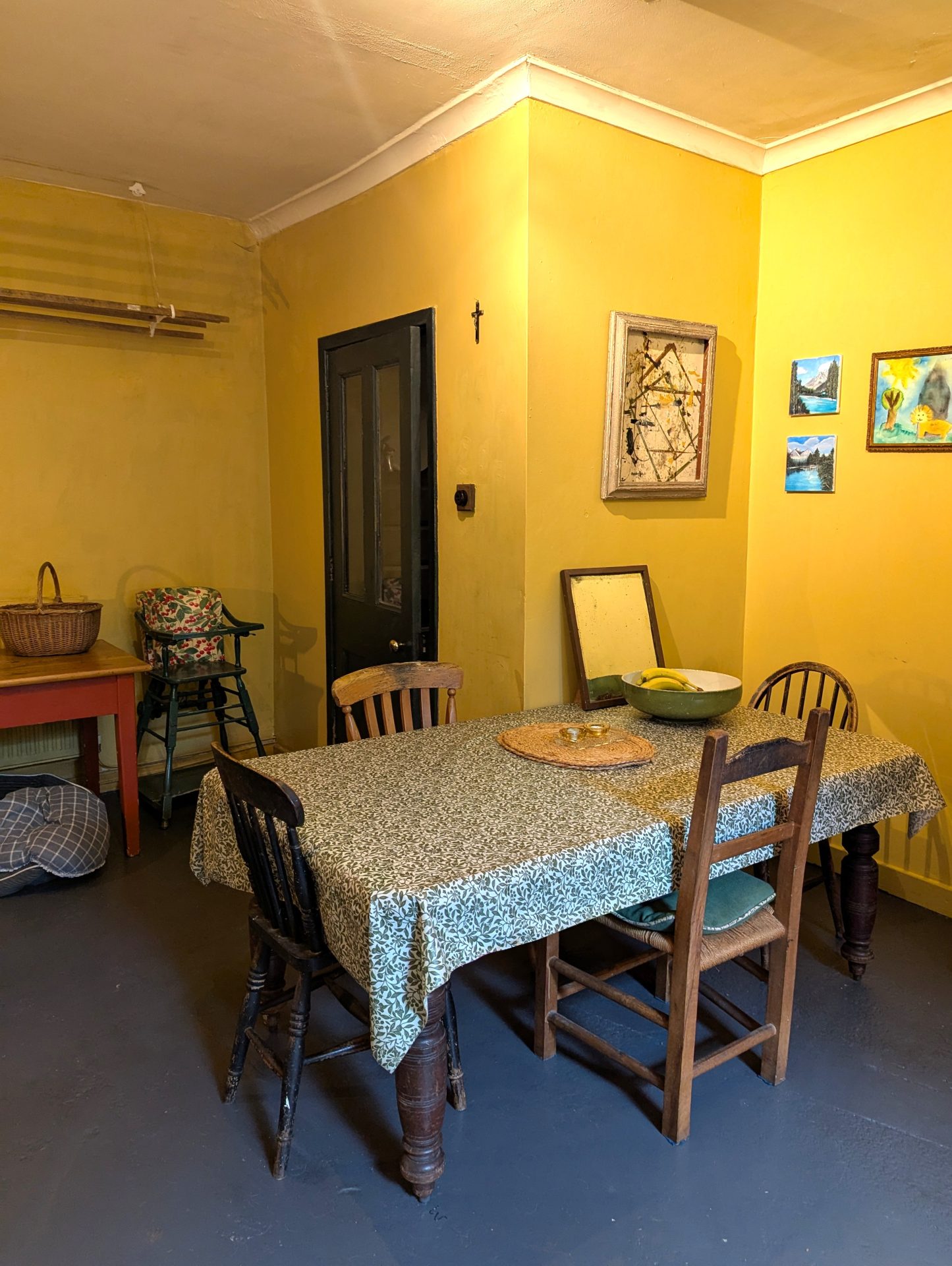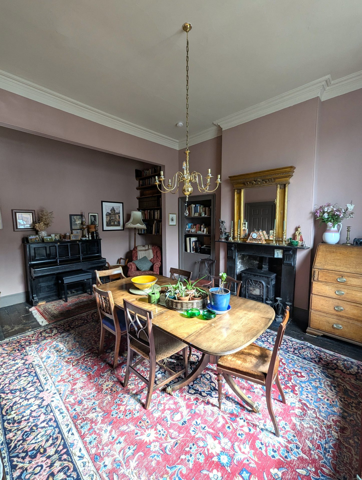 Door into the dining room from the ground floor hallway, radiator, fireplace with multifuel fire, window to the front of the property.