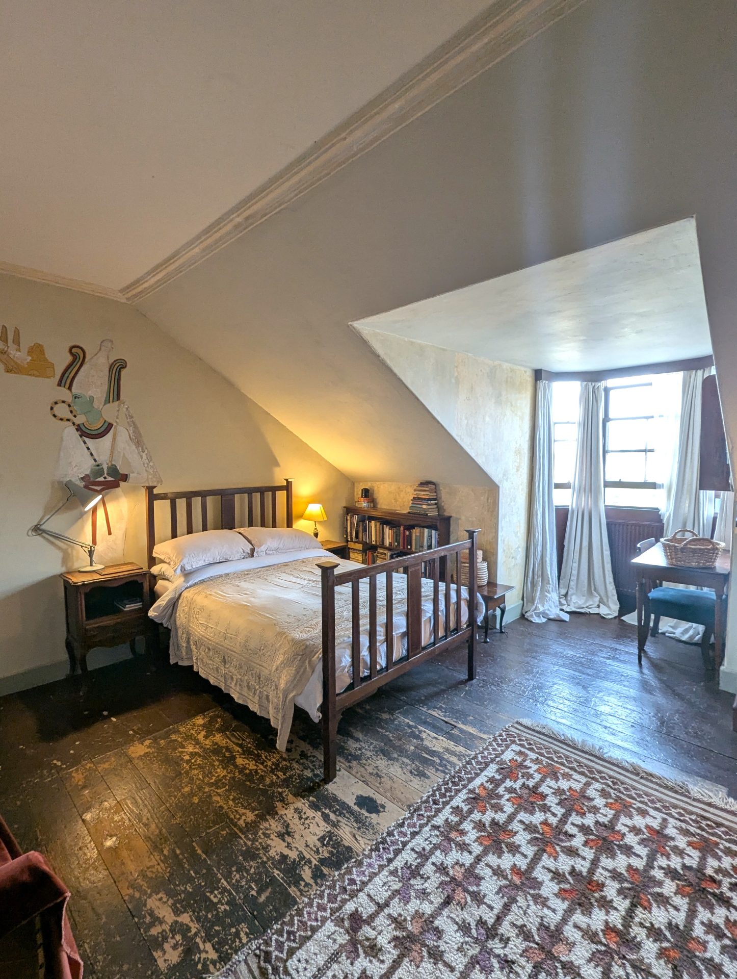 Door into bedroom five from the second floor hallway, bay window looking out to the front, radiator, fireplace with mantle, storage cupboard.