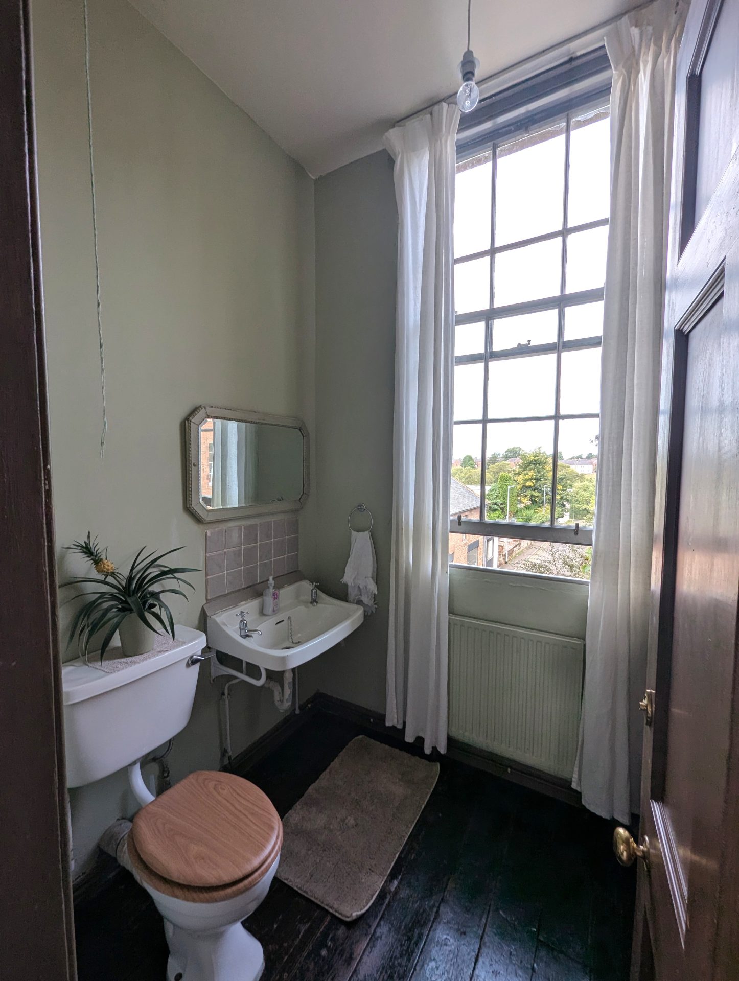 Door into the WC from the landing leading up to floor one, window out to the front of the property, WC, wash hand basin, plumbed for washing machine.