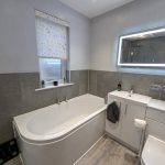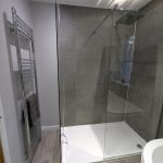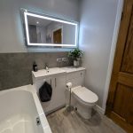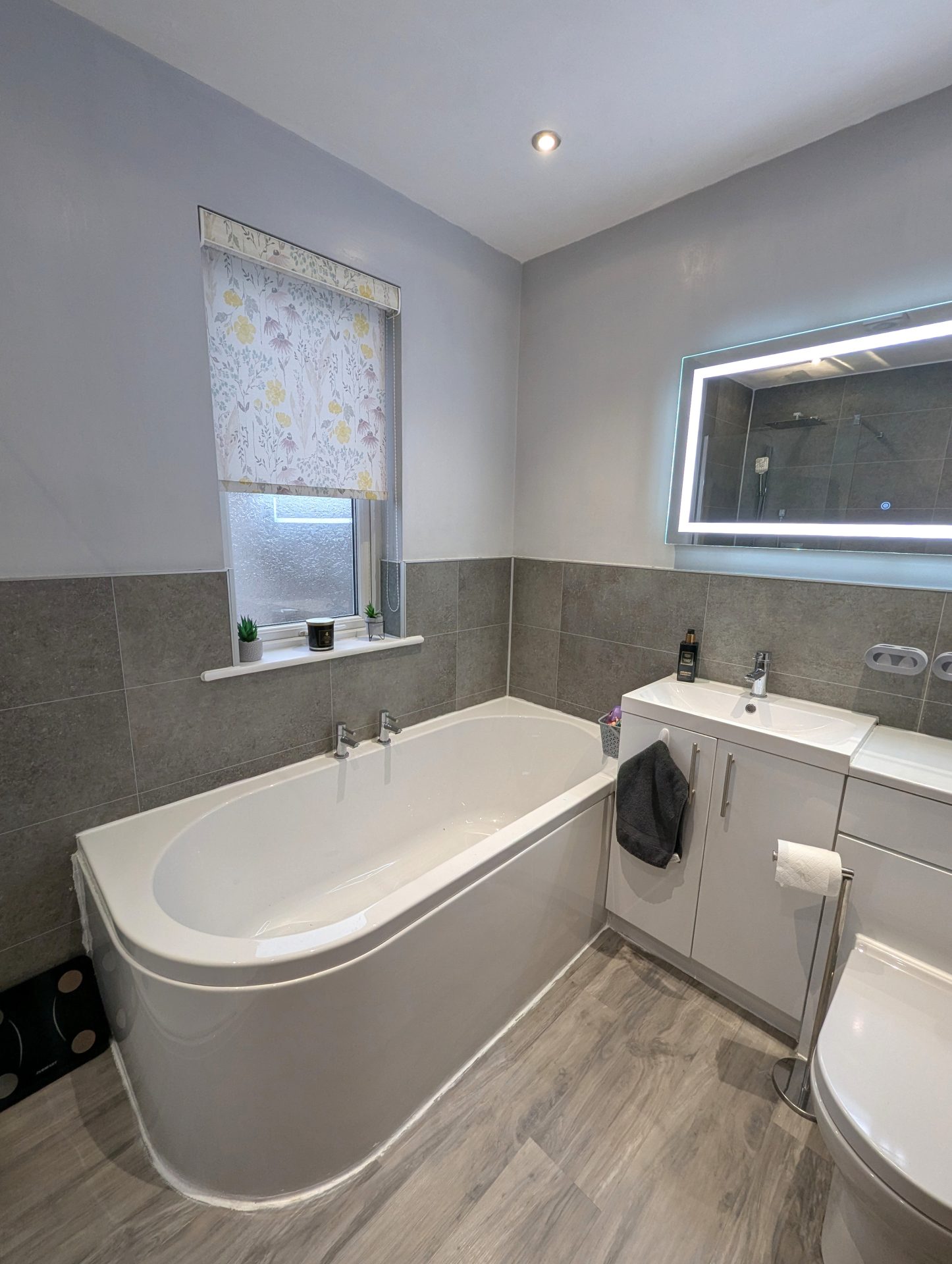 Laminate flooring, walk in shower enclosure with dual shower head, bath, WC, wash hand basin and vanity, heated towel rail, frosted double glazed window to side.