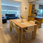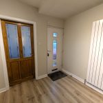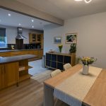 Wooden door with glass panels leading into dining area. Laminate flooring, radiator, open plan layout leading into kitchen and sun room.
