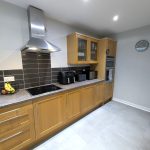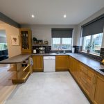 Tiled flooring, fitted base and wall units, breakfast bar with shelving underneath, integrated hob, oven and grill. Stainless steel sink, drainer and vegetable section, two double glazed windows to rear, understairs storage cupboard.