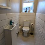 Wooden door into Cloakroom incorporating WC. Laminate flooring, tiled walls, frosted double glazed window to rear, radiator.