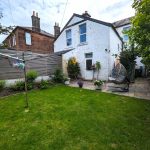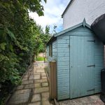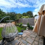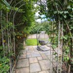 Patio consisting of concrete slabs, a lawn area surrounded by shrubs, access from the rear to the front via a side path.