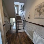 Wooden door into vestibule, wooden door with glass panels into hallway. Karndean tiled flooring, radiator, steps down to utility door and cellar door. Doors to living room and dining room, stairs to upper accommodation.