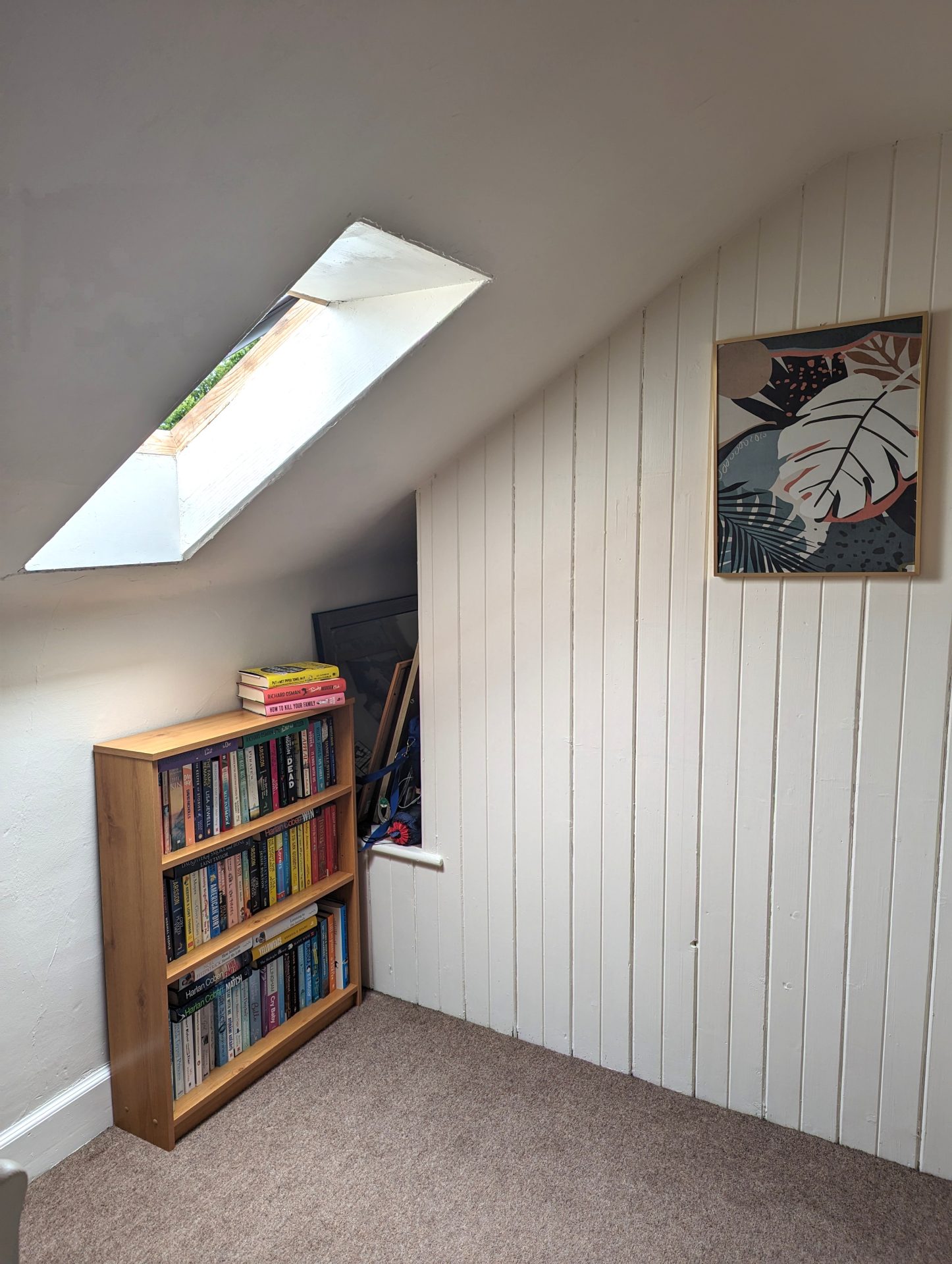 Stairs leading to attic rooms, fitted carpet, attic hallway with storage cupboards, doors to bedroom 4 and office.