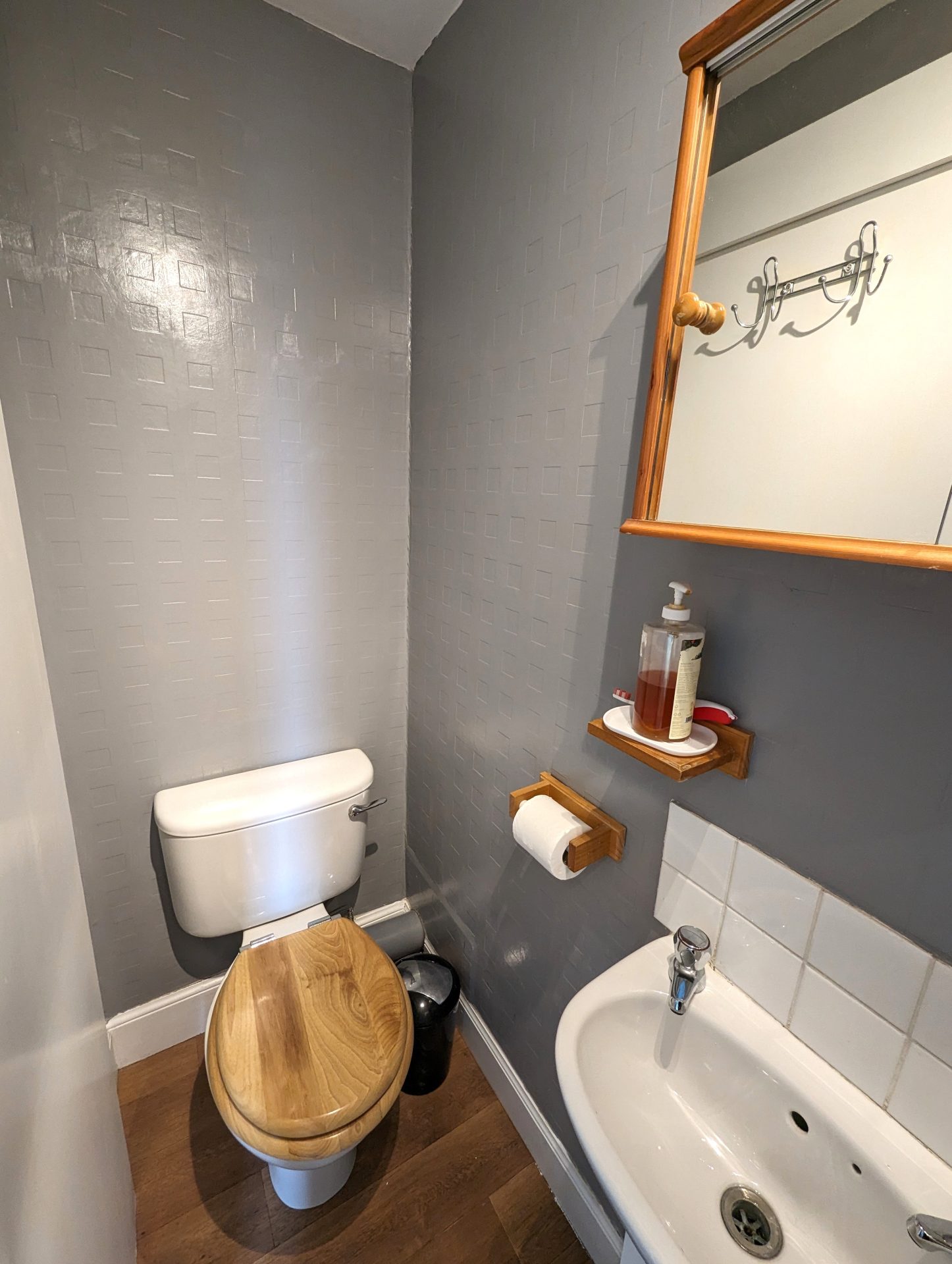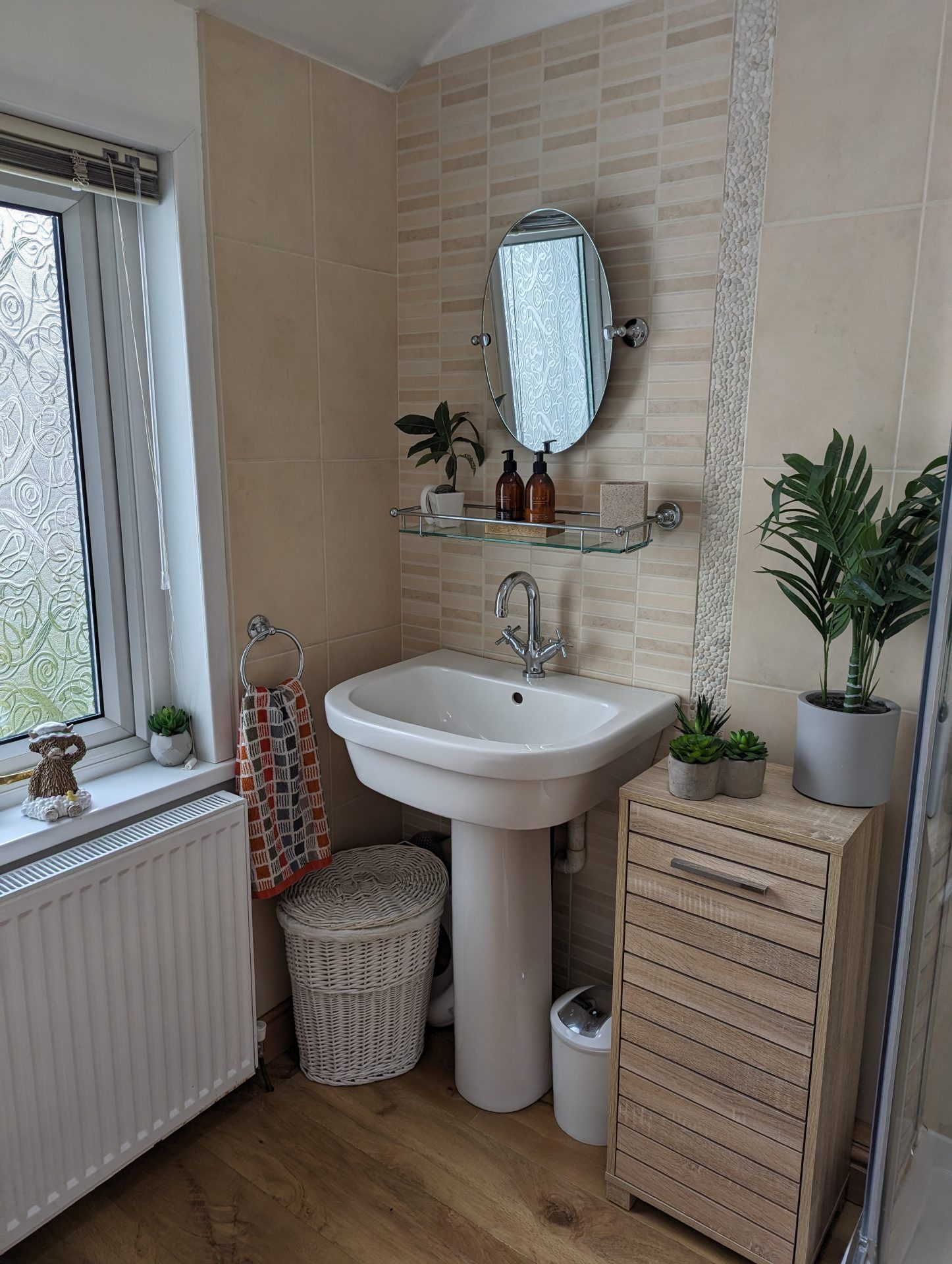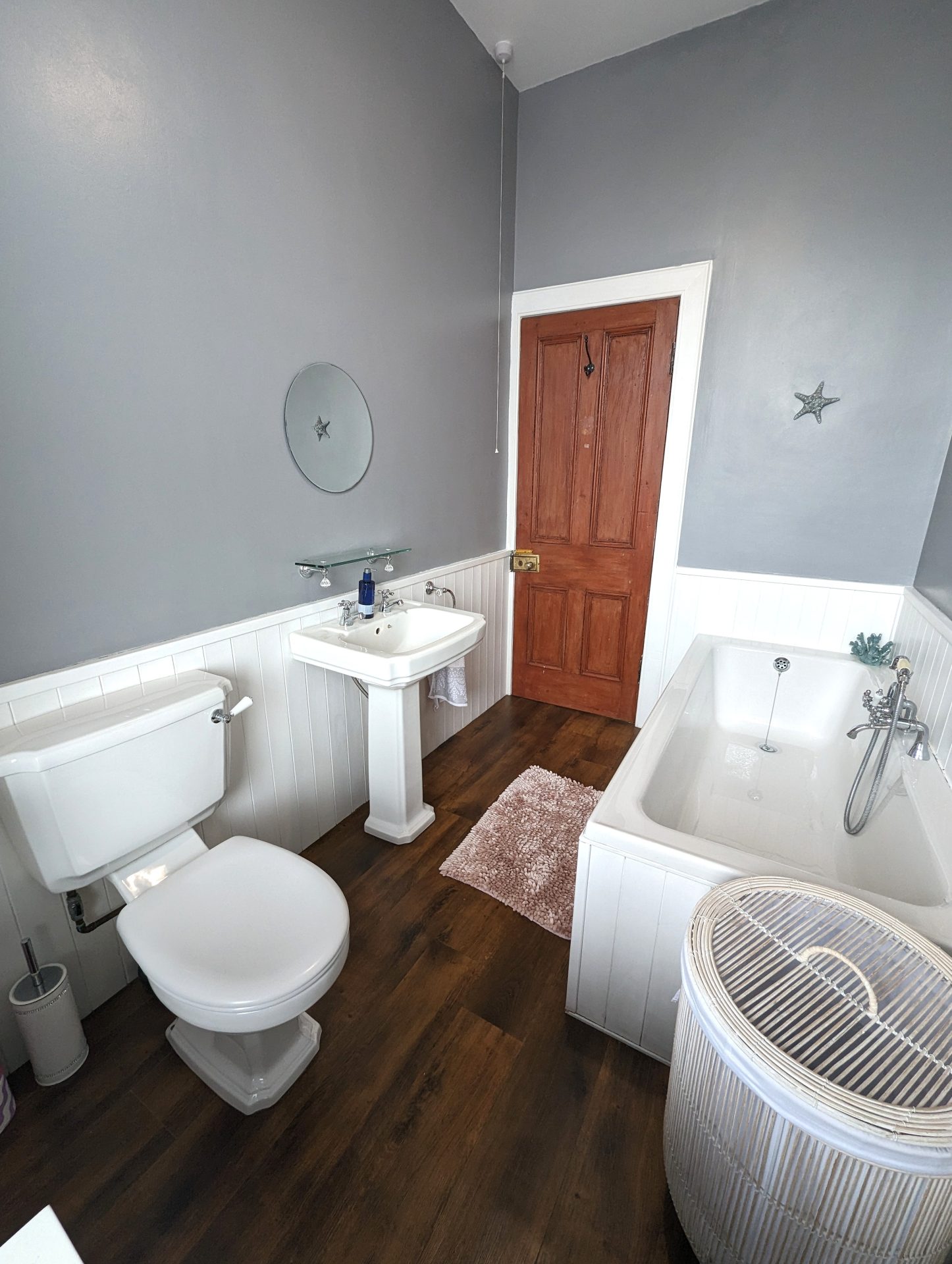 Karndean tiled flooring, wash hand basin, WC, bath, double glazed window to the front of the property, radiator.