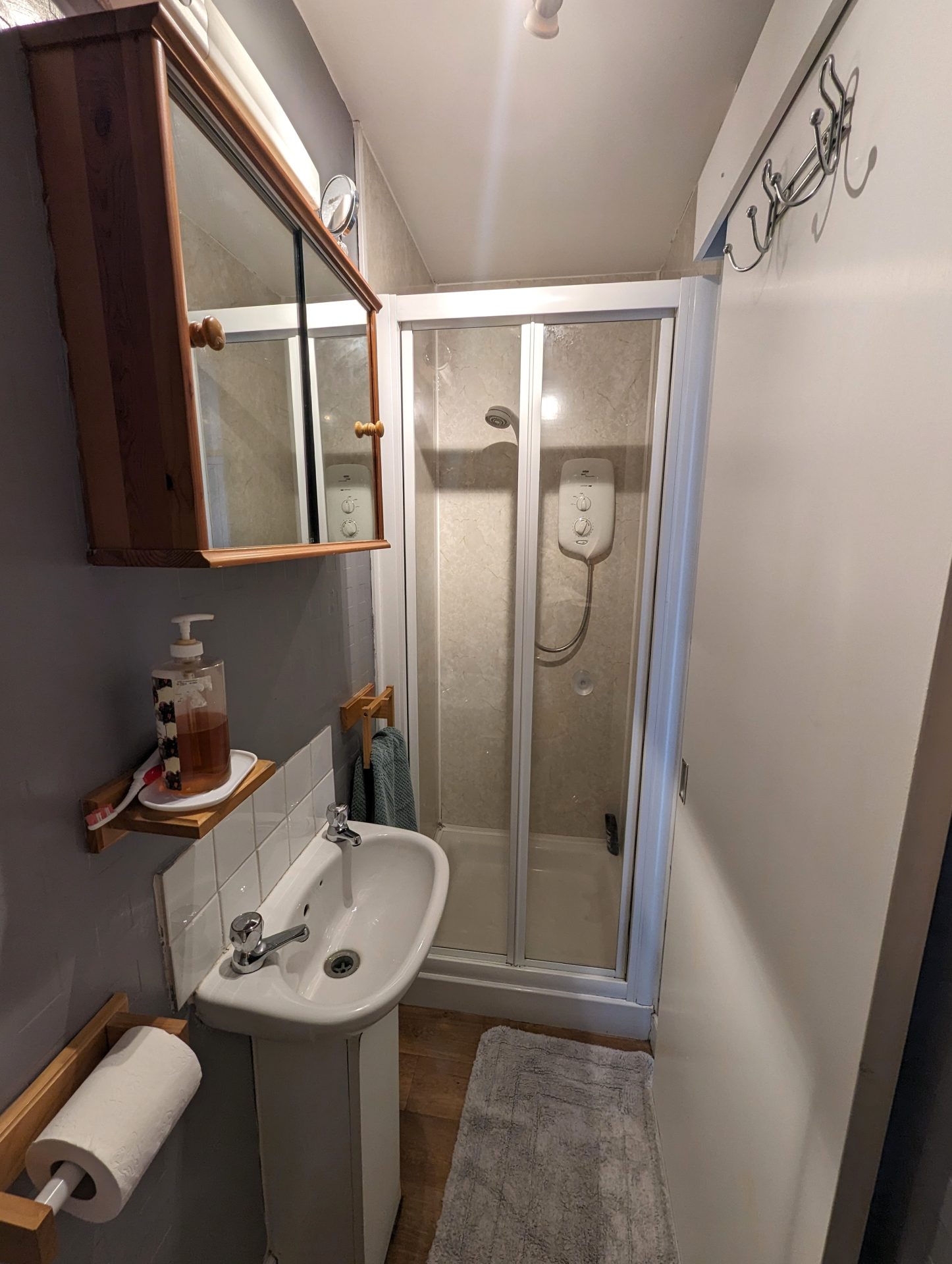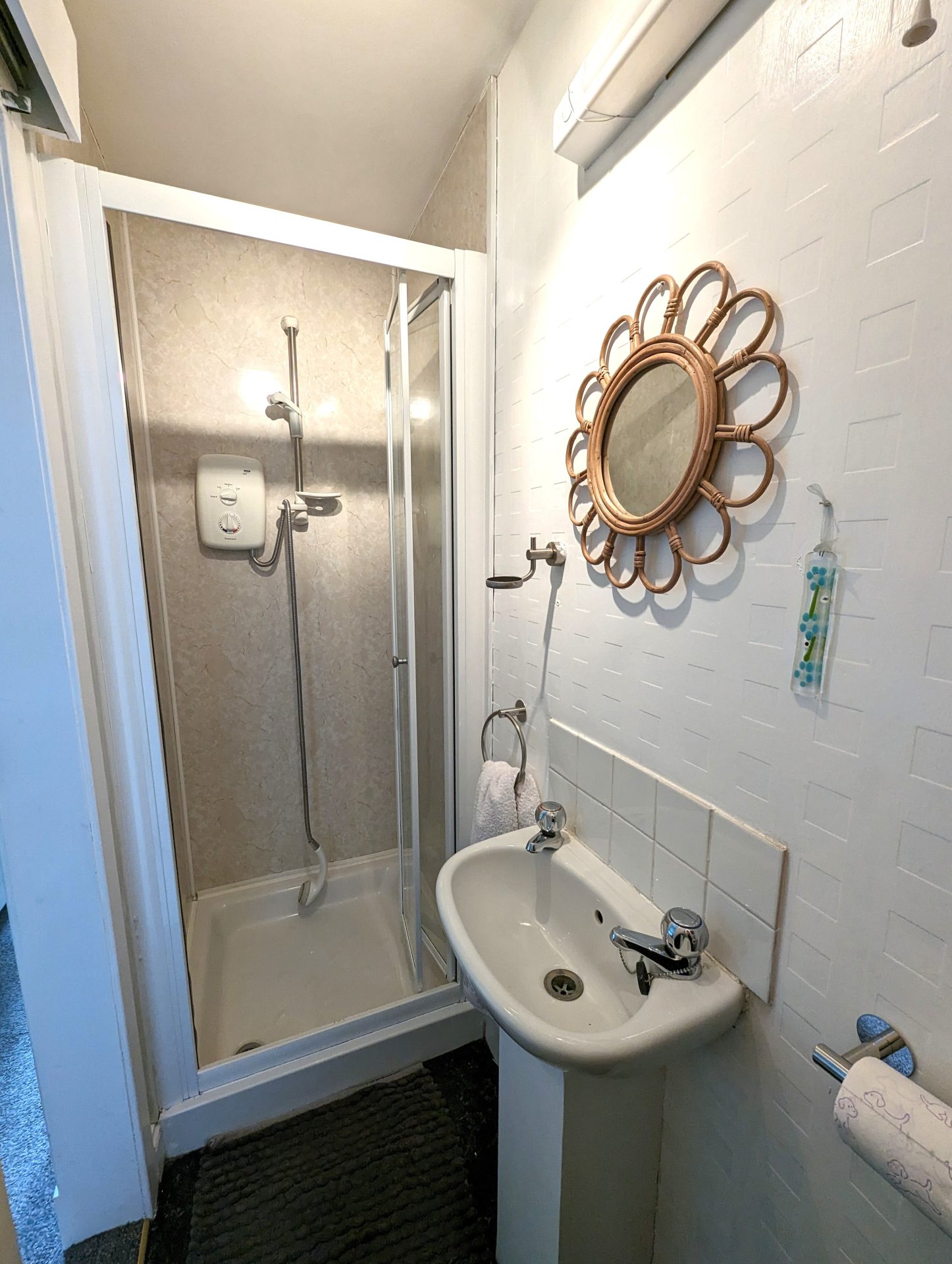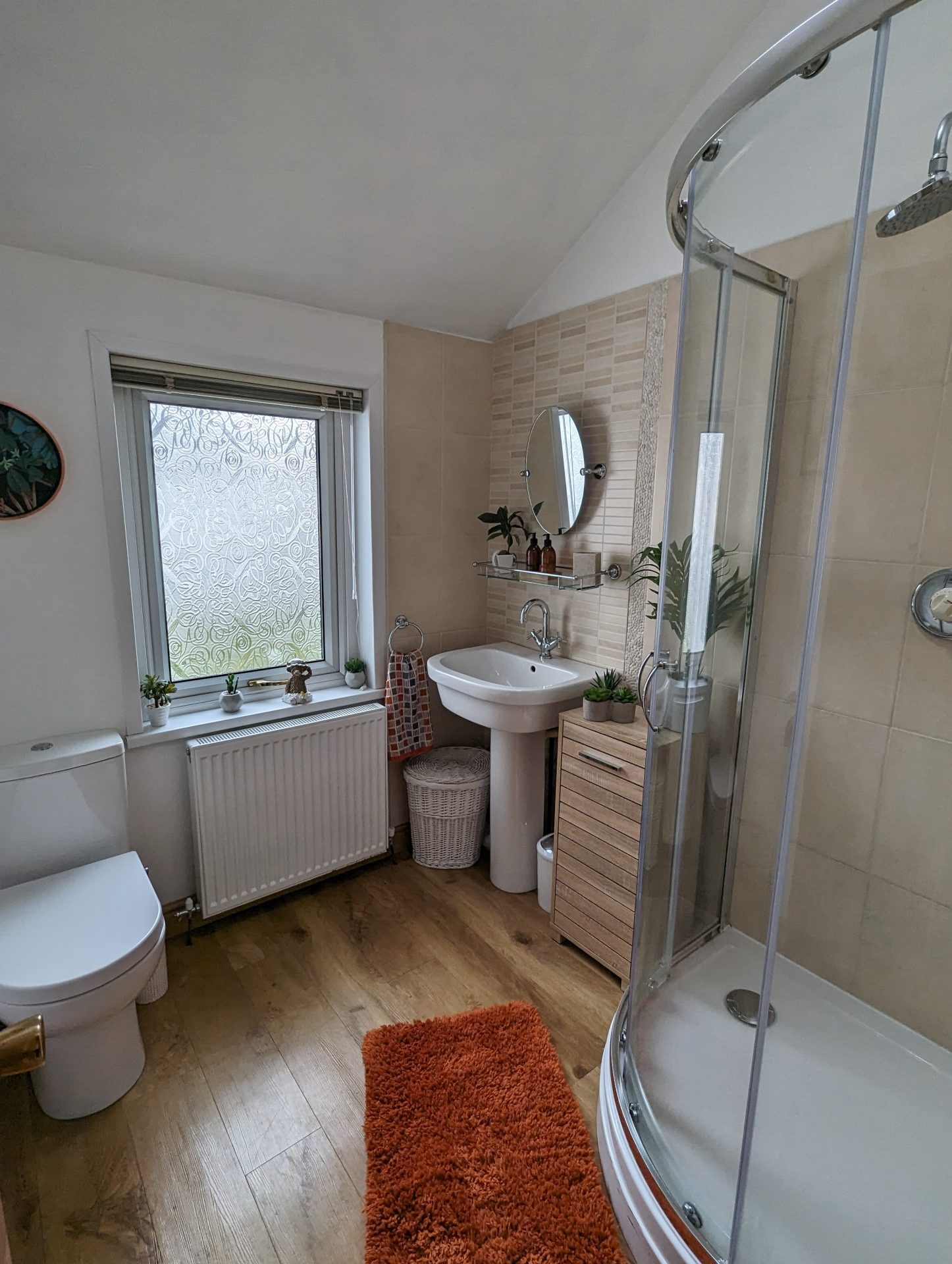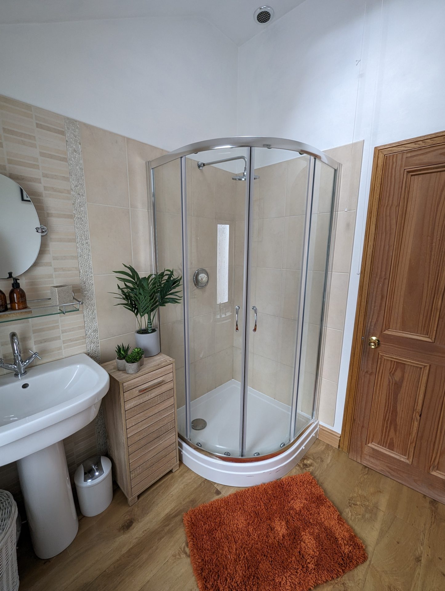 Karndean tiled flooring, quadrant shower cubicle with waterfall shower. WC, wash hand basin, radiator, frosted double glazed window to side of the property.