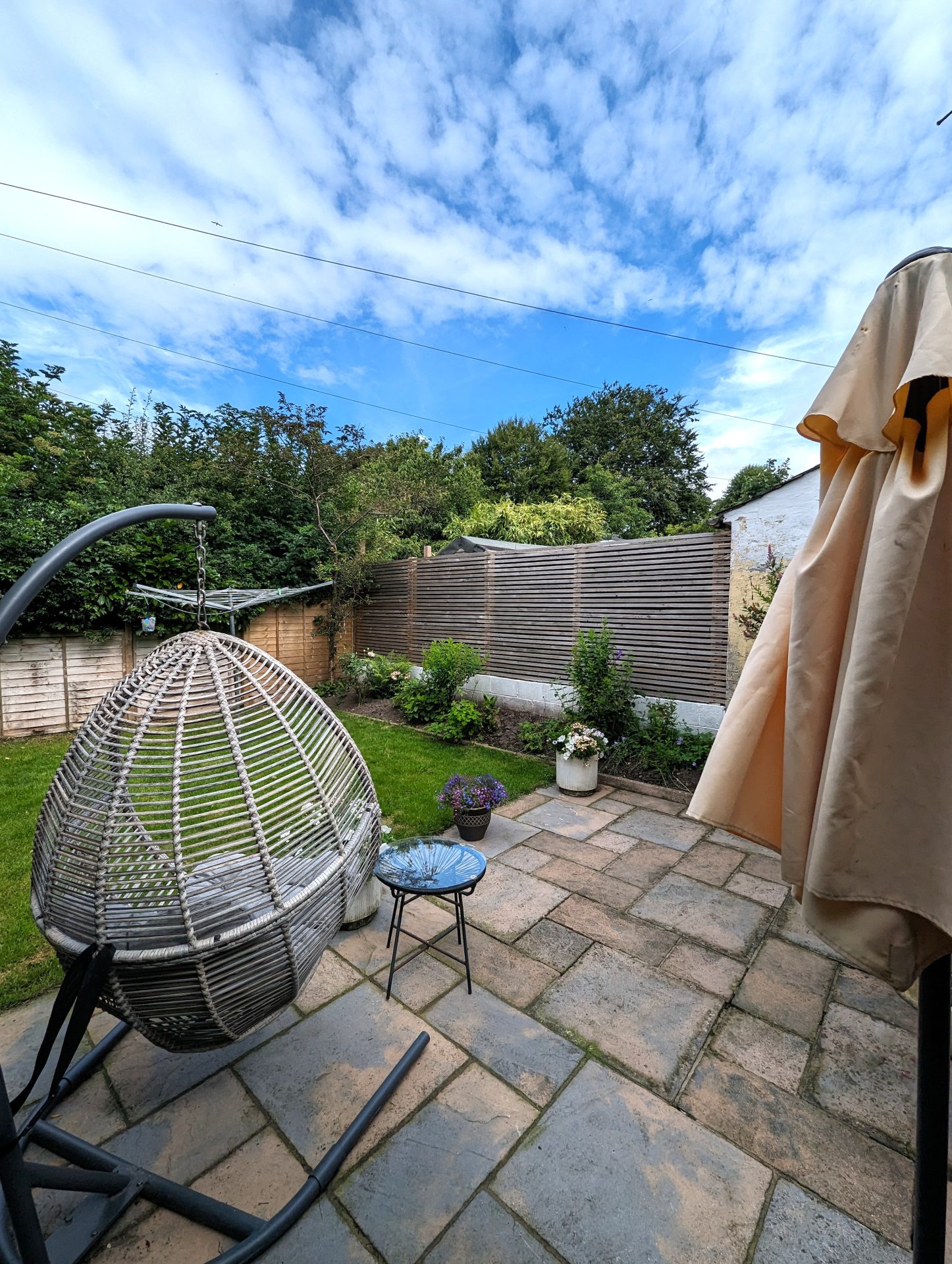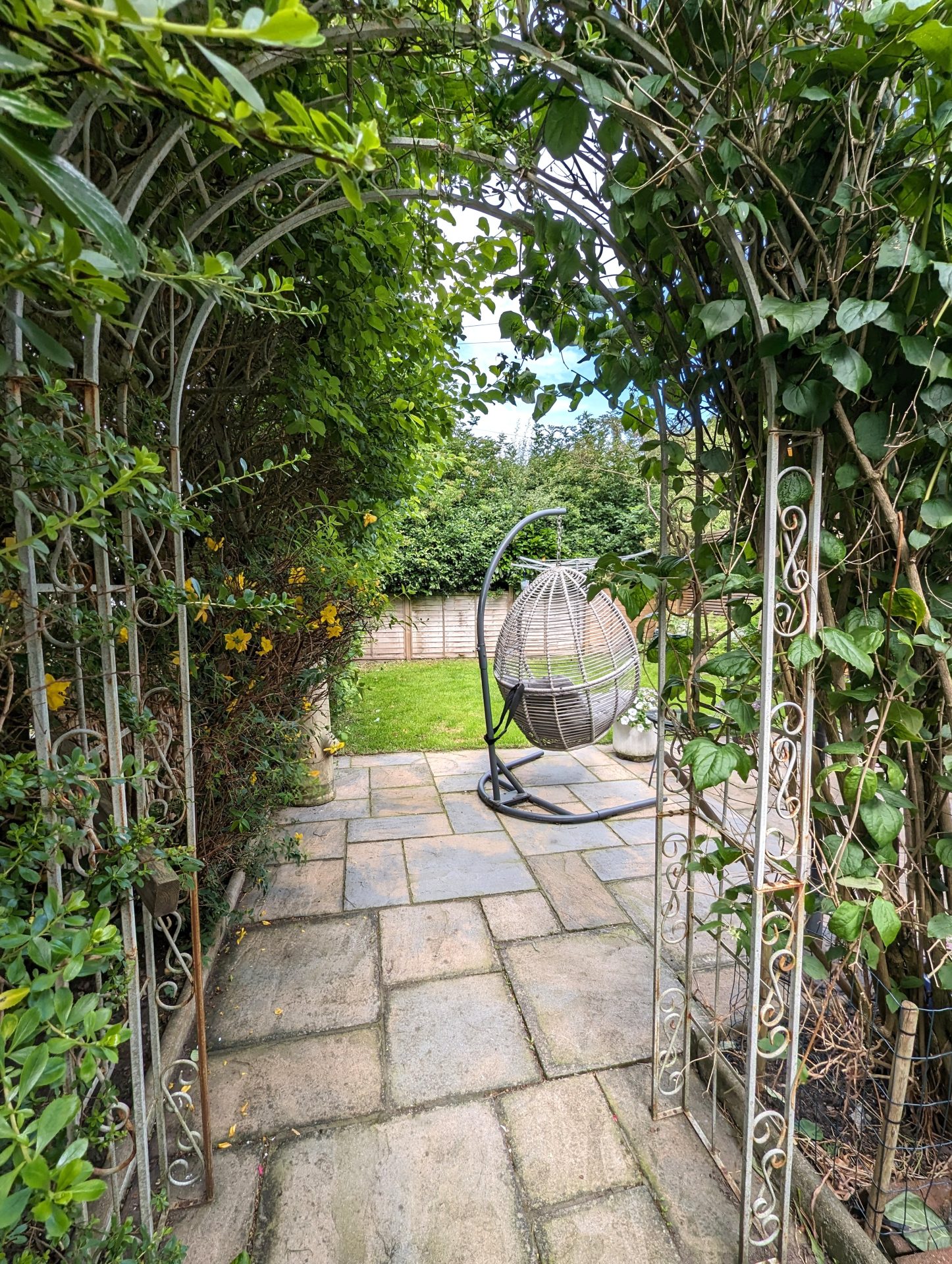 Patio consisting of concrete slabs, a lawn area surrounded by shrubs, access from the rear to the front via a side path.