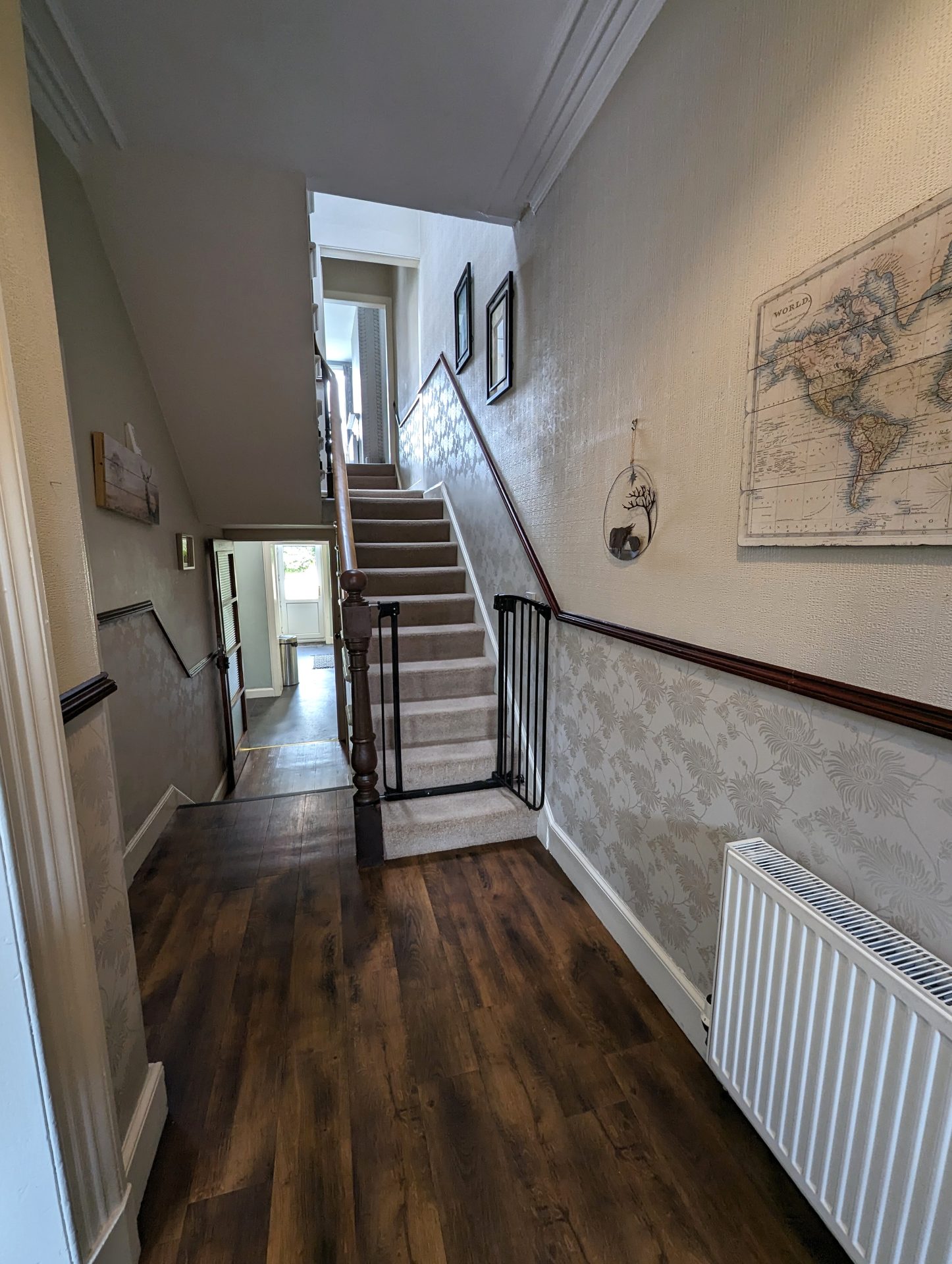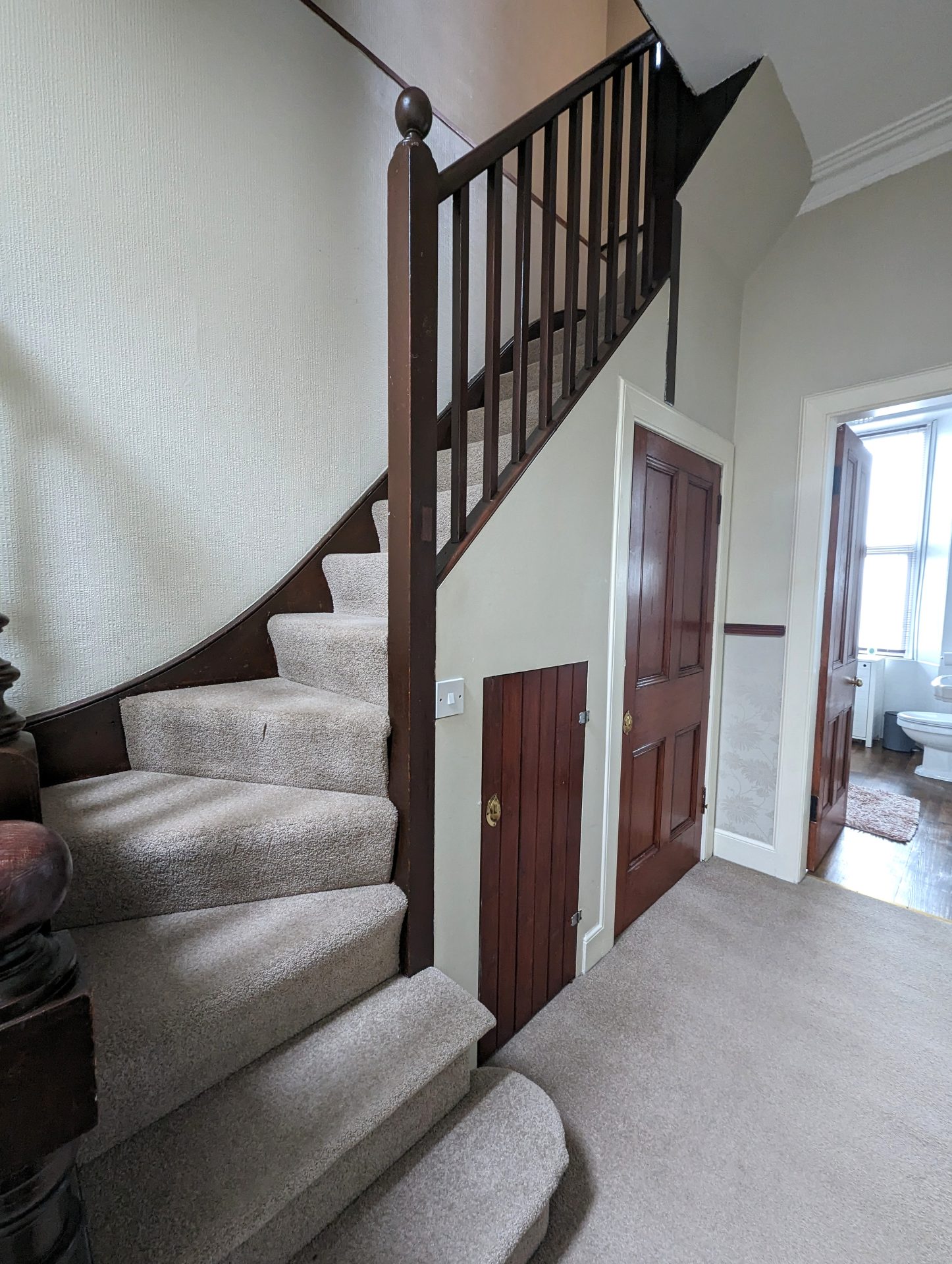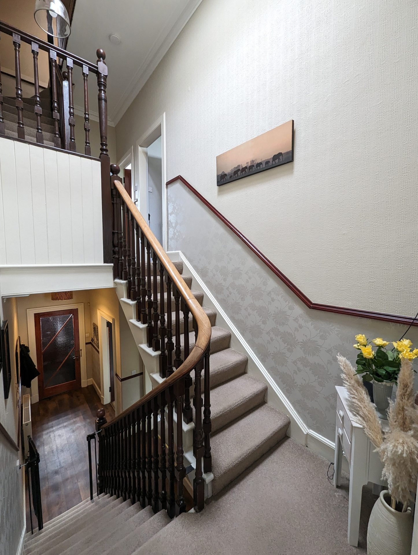 Stairs and landing with fitted carpet providing access to upper accommodation.
