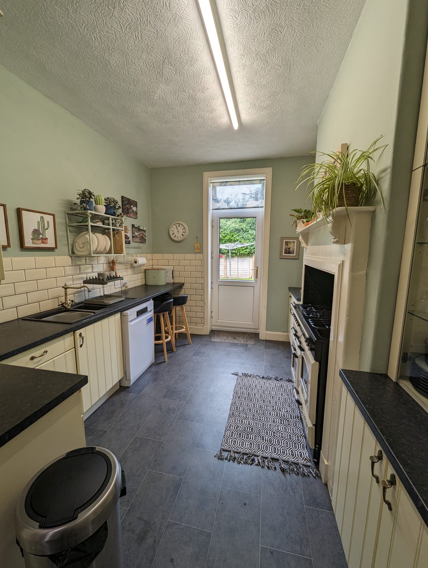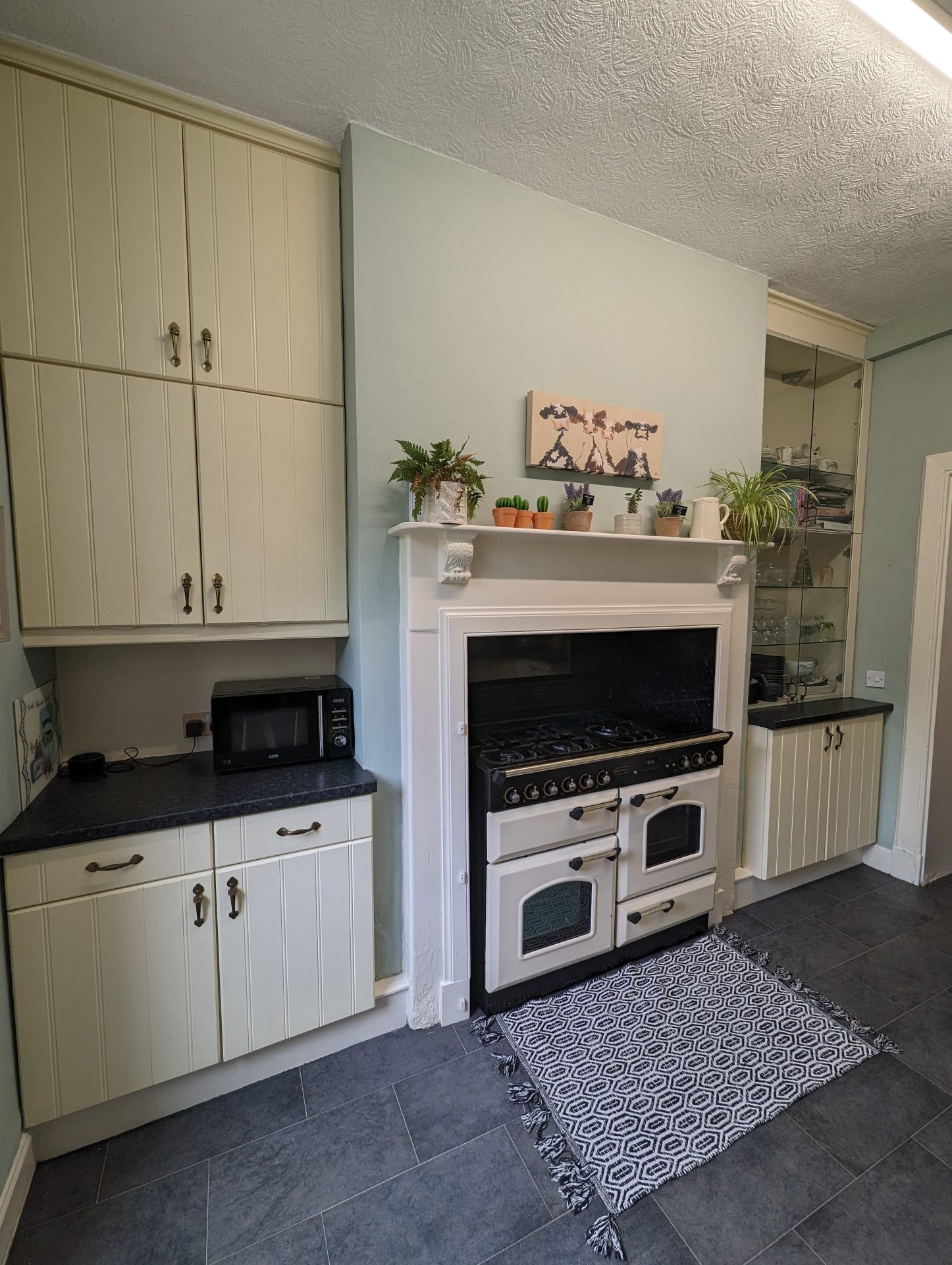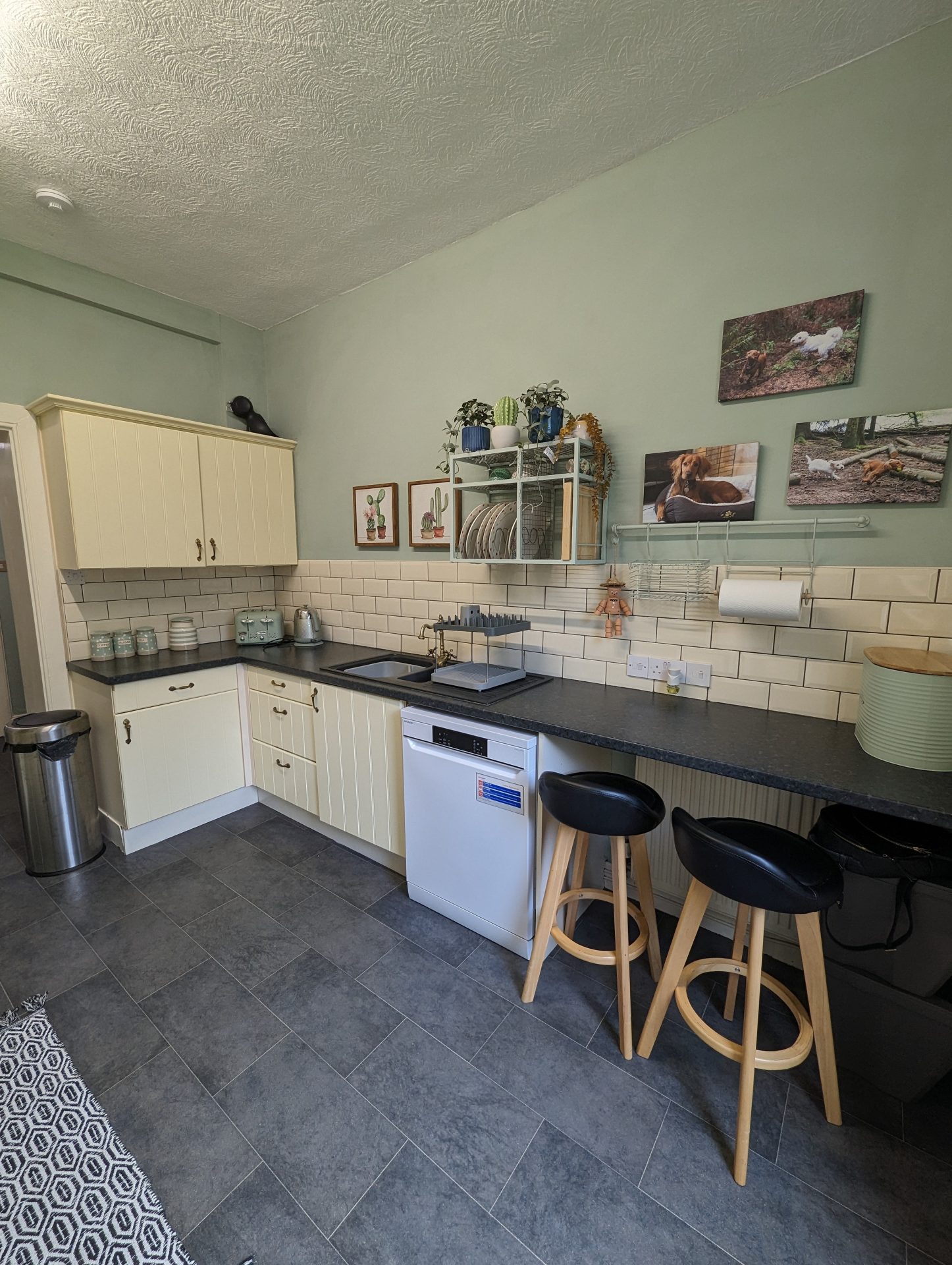 Vinyl flooring, radiator, uPVC door with double glazed window out to the rear garden. Range master cooker, integrated fan, fitted base and wall units with a glass display cabinet. Black sink & drainer with vegetable section, brass tap, plumbed for dishwasher, Breakfast bar.