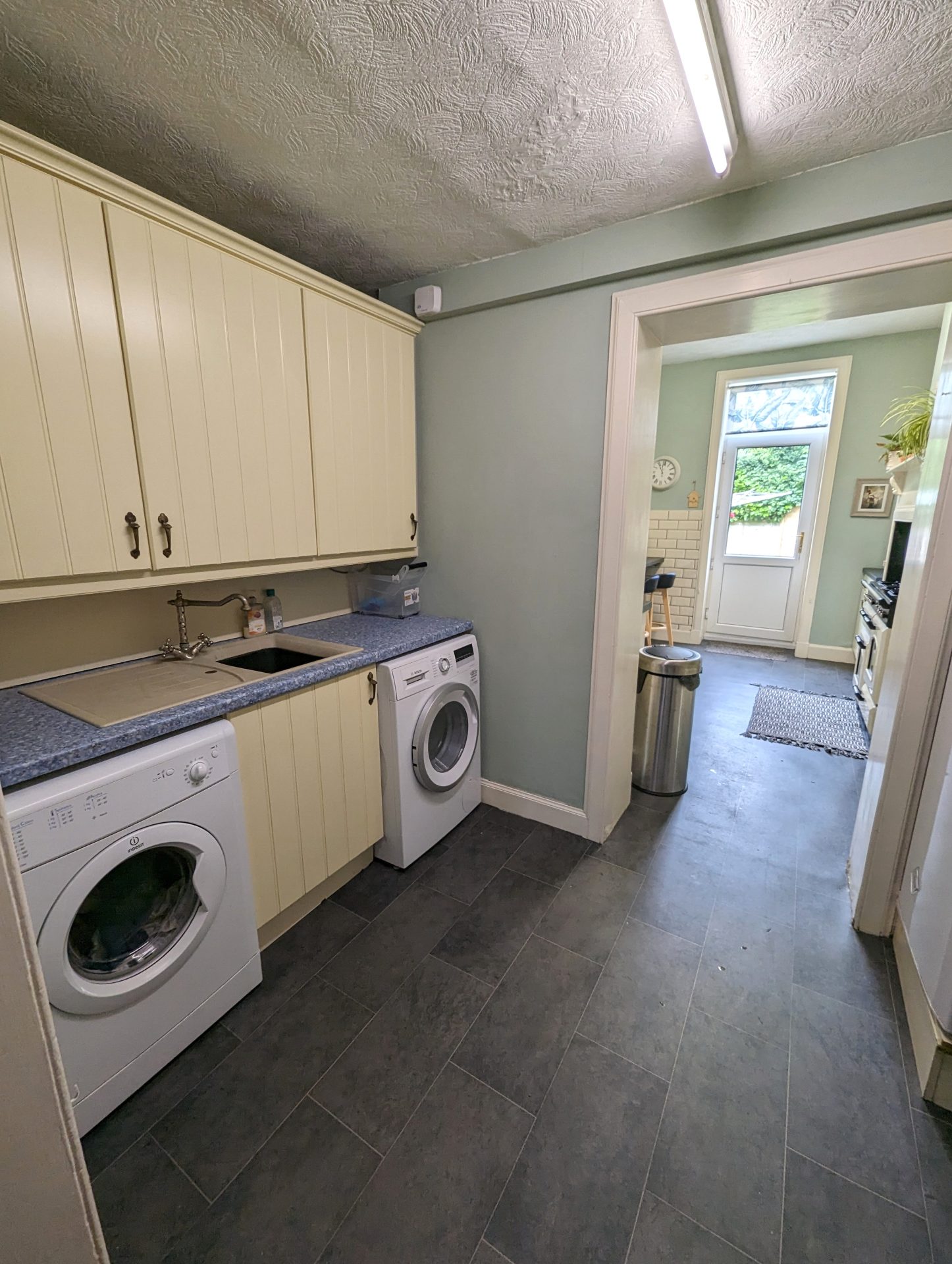 Viynl flooring, fitted base and wall units with sink and drainer, plumbed for washing machine.