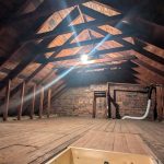 Walk in cupboard with wooden flooring, shelves, hooks, light, plug sockets, access to attic.
